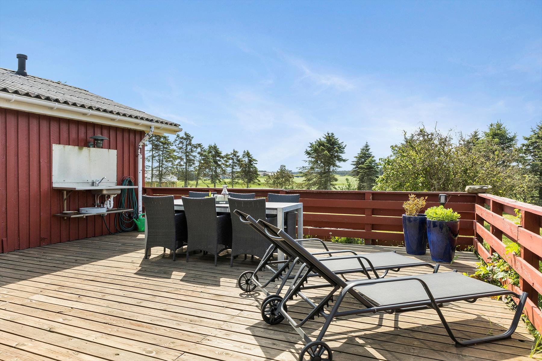 Drei schöne Terrassen mit Ausblick umgeben das Ferienhaus und bieten euch die Möglichkeit, von morgens bis abends die Sonne inmitten herrlicher Natur zu genießen. Eine der Terrassen ist westlich ausgerichtet und teilweise überdacht, sodass sie besonders abends ein idealer Ort ist: Hier könnt ihr die letzten Sonnenstrahlen des Tages genießen und auch danach noch sitzen bleiben, ohne euch um Tau sorgen zu müssen. Eine Außenküche und ein Holzkohlegrill stehen zur Verfügung, falls ihr unter freiem Himmel kochen möchtet. Und wenn ihr Lust auf Ballspiele oder Gartenspiele habt, bietet das 4.275 m² große Naturgrundstück viel Platz.