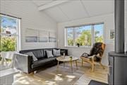 Das Baujahr ist 1970, somit steht das Sommerhaus schon seit einigen Jahrzehnten hier – und glücklicherweise wurde es kontinuierlich gepflegt und instand gehalten, so dass es schön und gut erhalten erscheint. Der Charme des Sommerhauses ist nicht zu übersehen, denn es gibt weiß gestrichene Holzwände, ein offenes Dach und einen Kamin im Wohnzimmer, und die Möblierung ist sowohl komfortabel als auch schön anzusehen. Im Wohnzimmer gibt es eine Sofaecke, einen Esstisch und eine gemütliche Bank, die dazu einlädt, sich nach dem Mittagessen mit der Zeitung hinzulegen. Die zweizeilige Küche ist nicht die größte der Welt, aber sie ist funktional eingerichtet. Außerdem bietet der Grundriss ein Duschbad und zwei Schlafzimmer mit insgesamt fünf Schlafplätzen.