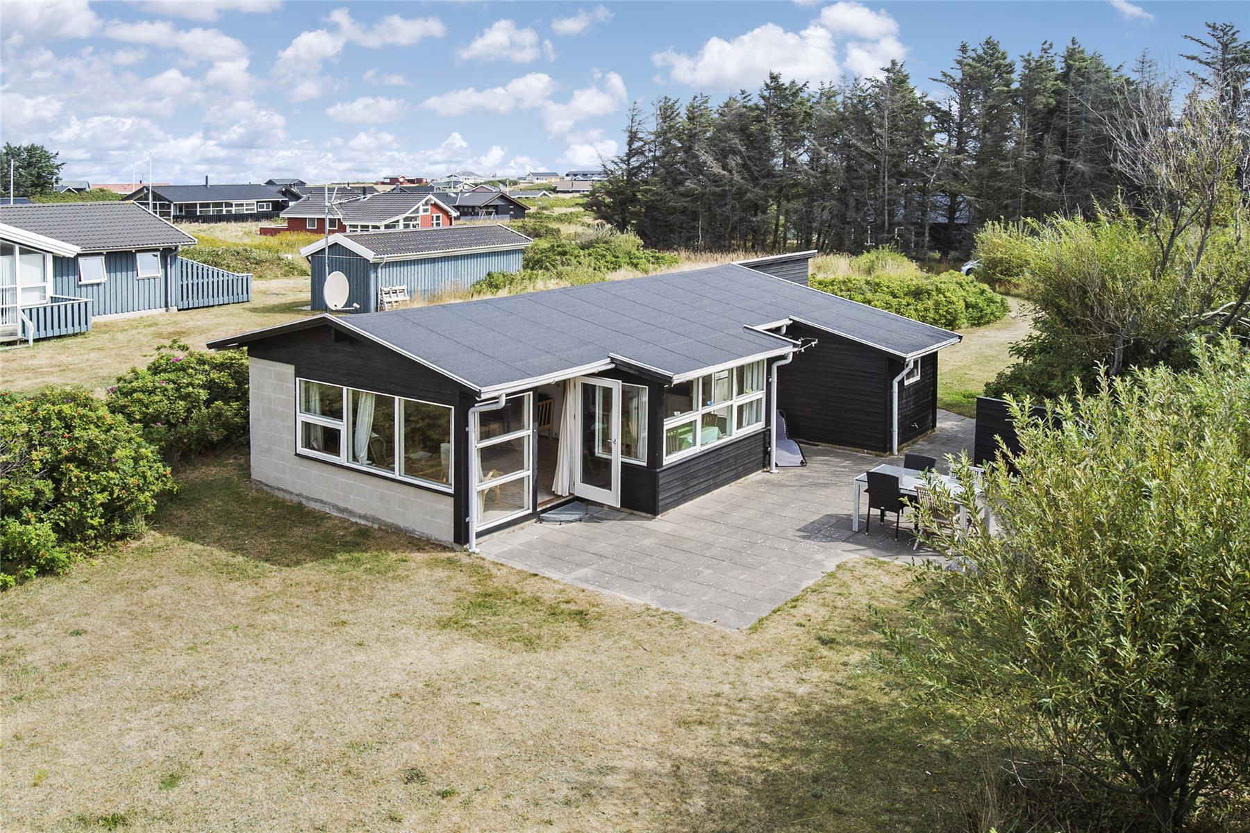 Auf der schönen, großen Terrasse können Sie sich den gesamten Tag hindurch von der Sonne verwöhnen lassen. Das Ferienhaus ist von niedrigen Bäumen und Büschen umgeben, die neben gutem Windschutz auch stets ein schattiges, ruhiges Plätzchen für Sie bereit halten. Die teilweise vorhandene Terrassenumrandung trägt zur Gemütlichkeit während geselliger Runden am Abend bei. Völlig unabhängig vom Alter, wird die große Grünfläche mit Sicherheit alle Urlaubsgäste zu Ballspielen und anderen Aktivitäten unter freiem Himmel animieren.