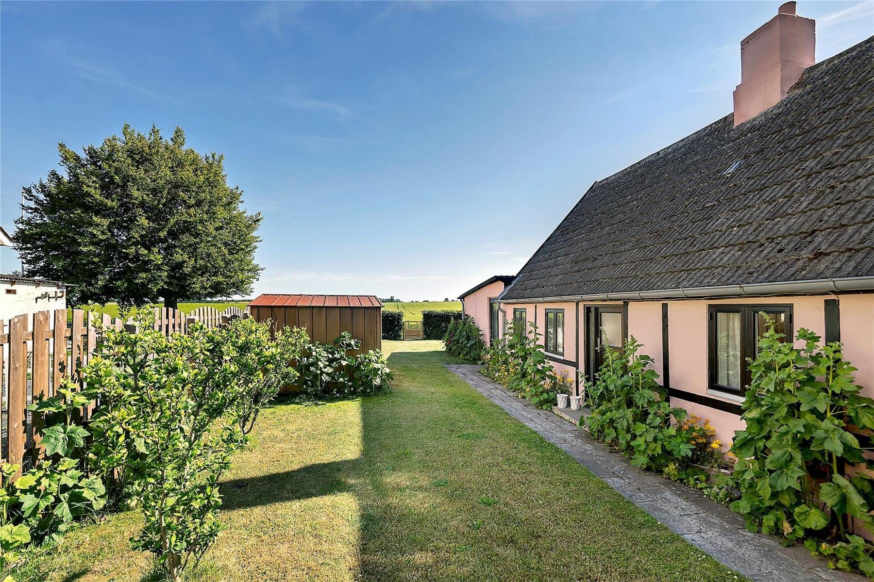 Gemütlicher, kleiner Garten mit neuer Holzterrasse, mit Grill, Gartenmöbeln und Blick über die offenen Felder auf der Rückseite des Hauses.