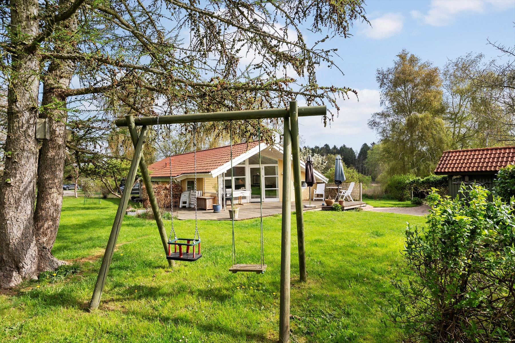 Das Sommerhaus ist von einem schönen Garten mit einer schönen großen, teilweise überdachten Holzterrasse umgeben, auf der Sie die Gesellschaft der anderen genießen und die Mahlzeiten des Tages einnehmen können. Wenn es dunkel wird und der Tau fällt, können Sie unter dem überdachten Teil sitzen und die Ruhe genießen. Im Garten gibt es für die Kinder eine Schaukel und viel Platz zum Spielen und Toben. Vom Haus sind es nur 400 Meter zum kinderfreundlichen Strand von Råbylille.