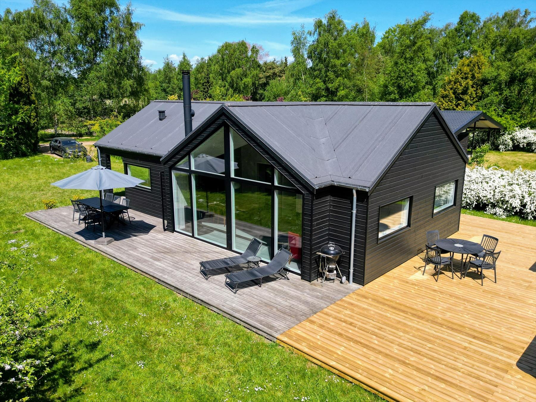 Vom Wohnzimmer aus gelangen Sie direkt auf eine große und gemütliche Holzterrasse mit schönen Gartenmöbeln, Sonnenschirm und Liegestühlen. Das große Grundstück ist von einer schönen Bepflanzung umgeben und hier können die Kinder herumtollen, während Sie die warmen Tage auf der Terrasse genießen. Vom Haus sind es nur 100 Meter bis zum schönen Strand.