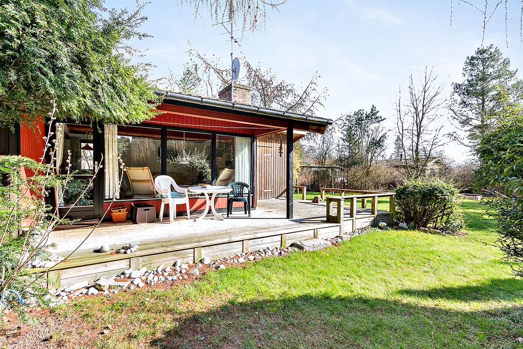 Das Sommerhaus ist von einem wunderschönen Garten umgeben und verfügt über eine schöne, teilweise überdachte Terrasse mit bequemen Gartenmöbeln. Hier können Sie die warmen Tage und Abende genießen. Wenn der Tau fällt, können Sie sich unter die Terrasse zurückziehen und die Ruhe unter dem Sternenhimmel genießen. Hier finden Sie Raum für Gemütlichkeit, Entspannung und Naturerlebnisse. Vom Haus aus sind es nur 250 Meter zum kinderfreundlichen Strand Råbylille mit seinen Klippen.