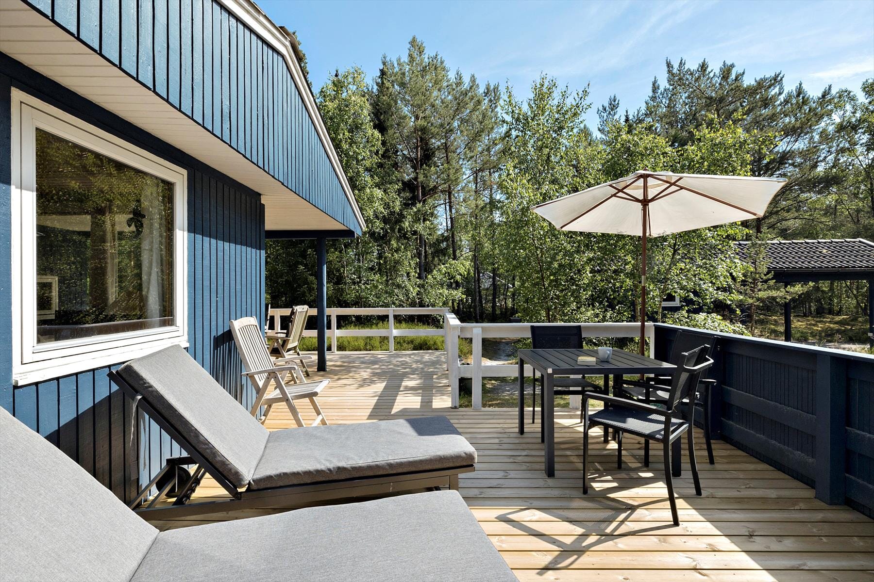 Das gemütliche und gut eingerichtete Ferienhaus mit einer großen Holzterrasse begrüßt dich mit einem ansprechenden Wohnraum, der über einen guten Essplatz, eine funktionelle Küche und eine Polstersitzgruppe samt Fernseher verfügt. An kühlen Abenden verwöhnt dich der Kaminofen mit behaglicher Wärme und einem Maximum an echter Ferienhausatmosphäre. Vom Wohnraum aus gelangst du auf eine große, offene und sonnige Holzterrasse mit Gartenmöbeln. Einer der drei guten Schlafräume beinhaltet ein Doppelbett. In den anderen beiden Räumen stehen jeweils zwei Einzelbetten zur Verfügung. Das Badezimmer ist mit einer Dusche, einem WC und einer Fußbodenheizung versehen. Dieses gute, gemütliche Ferienhaus lädt dich und deine Lieben zu gelungenen Urlaubstagen ein.