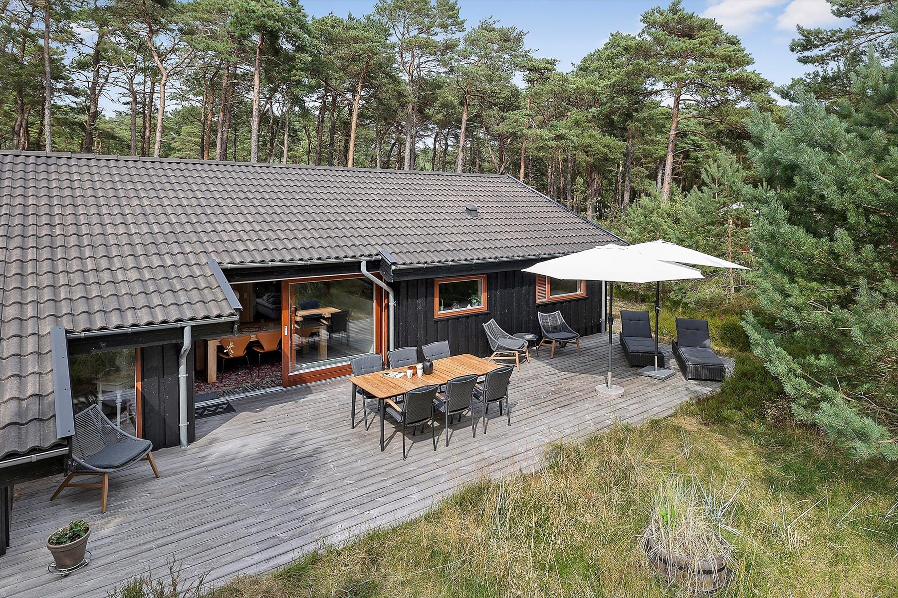 Das Ferienhaus befindet sich auf einem 2.655 m² großen Naturgrundstück in ruhiger, bewaldeter Umgebung. Auf der schönen Terrasse laden Gartenmöbel zu gemütlichen Stunden und geselligen Runden ein. Ihren Pkw parken Sie am Haus.