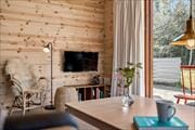 Holzferienhaus für bis zu 10 Personen mit Raum für besten Urlaub. Das Ferienhaus wurde 2019 um einen neuen Anbau mit einer geräumigen Eingangshalle mit viel Platz erweitert. 5 Schlafzimmer und 2 Bäder sind in zwei Bereiche um den zentralen Gemeinschaftsraum mit Wohnzimmer, Essbereich und Küche aufgeteilt. Das Wohnzimmer ist hell und einladend mit Panoramafenstern und Zugang zur großen möblierten Terrasse. Der Essbereich befindet sich in der Nähe der Küche und verbindet harmonisch und praktisch das ganze Haus. 4 Schlafzimmer haben Doppelbetten und ein Schlafzimmer hat zwei Einzelbetten. Beide Bäder sind gut und praktisch eingerichtet. Eine Besonderheit sind die im Anbau verwendeten Materialien, die dieses Ferienhaus zu etwas Besonderem machen. Der Anbau hat eine sichtbare, tragende Holzstruktur und eine Holzverkleidung, die den Räumen Charakter und Wärme verleiht. Der Fußboden besteht aus rohem, glänzendem Beton, der mit der Holzverkleidung entlang der Fassade eine praktische und schöne Bank bildet.