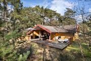 Die überdachte Terrasse ist durch die Hauswände wunderbar geschützt. Die offene Terrasse ist ebenso wie die geschlossene nach Süden gerichtet. Das Naturgrundstück umfaßt eine Fläche von 2.500 Quadratmetern in bewaldeter Umgebung.