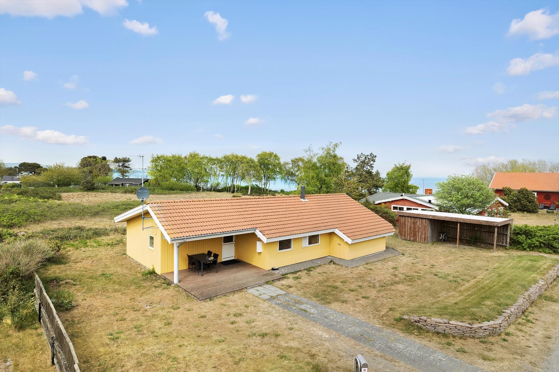 Das Ferienhaus grenzt an eine offene Fläche mit Bäumen und Büschen. Das Meer lockt in einer Entfernung von lediglich 100 Metern. Zwei Hausseiten sind von einer großen und teilweise überdachten Terrasse umgeben auf der du es dir gemütlich machen und den Blick auf das Meer im Hintergrund genießen kannst. An der Vorderseite des Hauses steht zusätzlich eine kleine Terrasse zur Verfügung. Dein Auto kannst du direkt vor dem Haus abstellen. Hier befindet sich auch der kleine Garten, in dem die Kinder vergnügt Ballspielen und Umhertollen können.