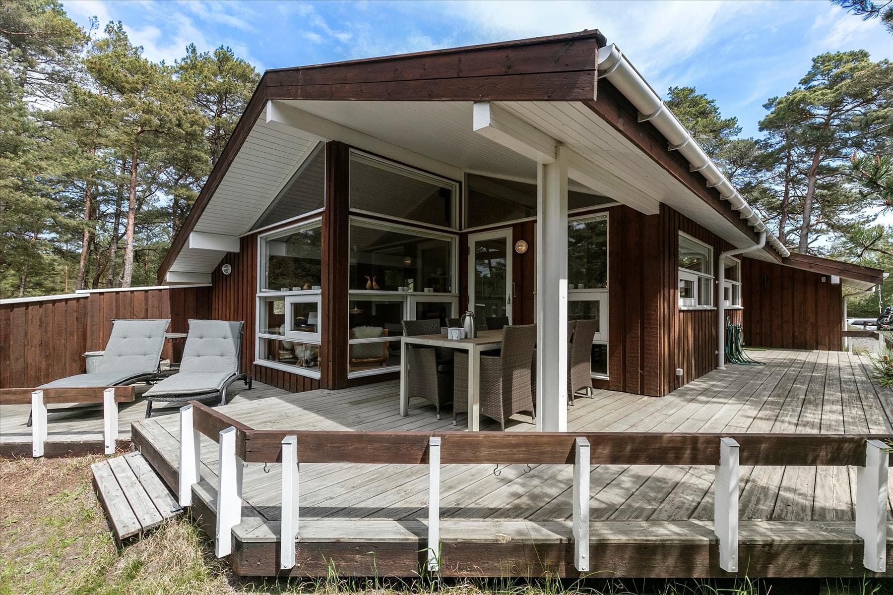 Mit einer abgeschirmten und teils überdachten Terrasse kannst du den Tag und die Abendstunden genießen, vielleicht ist der Gesang der Nachtigall im Hintergrund zu hören. Gut möblierte Terrasse. Das Haus liegt auf einem 2.500 m² großen Naturgrundstück mit einer Mischung aus Nadel- und Laubbäumen, trotzdem gelangt Sonnenlicht hindurch. Das Auto wird unter dem Carport geparkt.