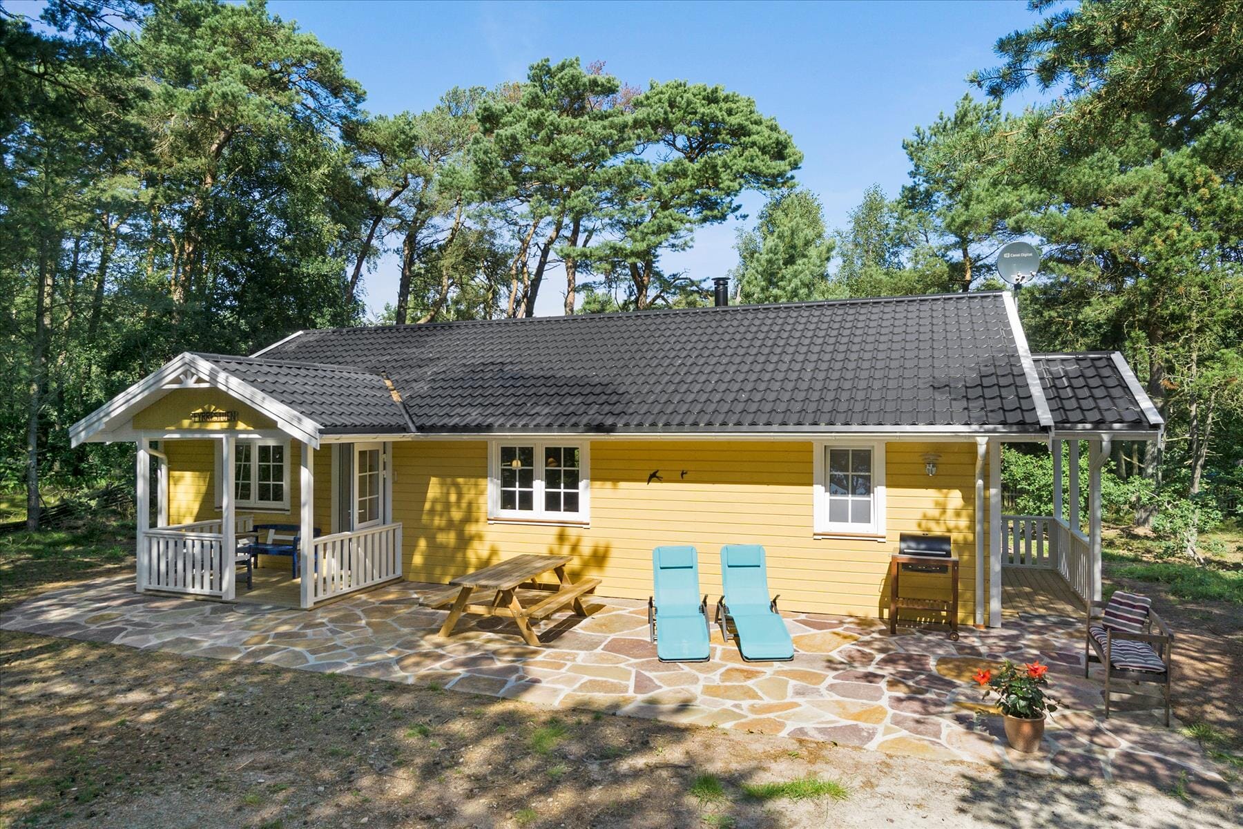 Das Ferienhaus liegt etwas erhöht im Vergleich zum vorbei führenden Waldweg. Dein Auto kannst du direkt am Haus abstellen. Der Eingangsbereich und ein kleiner Teil der Terrasse sind überdacht. Auf der großen, offenen Terrasse wurden Sandsteinplatten verlegt. Auf dem Grundstück steht zudem ein Schuppen zum Unterstellen der Fahrräder oder des Kinderwagens zur Verfügung. Das Grundstück und das Haus sind von vielen Bäumen und Büschen umgeben. Den ganzen Vormittag kannst du jedoch auf der Terrasse die Sonne in vollen Zügen genießen.