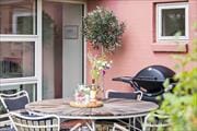 Der grüne Garten mit kleinen Wegen, einer Grasfläche und Blumenbeeten ist sehr gepflegt. Er ist von dichten, gut abschirmenden Bäumen und Hecken umgeben und wirkt wie eine private Oase. Sie halten sich im Freien gänzlich ungestört auf. Kinder und Hunde sind hier ebenfalls sehr gut aufgehoben. Mehrere Terrassen und zahlreiche gemütliche Eckchen mit Gartenmöbeln und Liegestühlen stehen für Sie bereit. Vom Wintergarten treten Sie hinaus auf eine schöne Terrasse mit einem Essplatz, von dem Sie über das schön angelegte Grundstück blicken. Vor dem gemütlichen Nebengebäude, das in den Sommermonaten zwei Schlafplätze bietet, erstreckt sich mitten im Garten eine kleine Terrasse mit einem Tisch und Bänken.