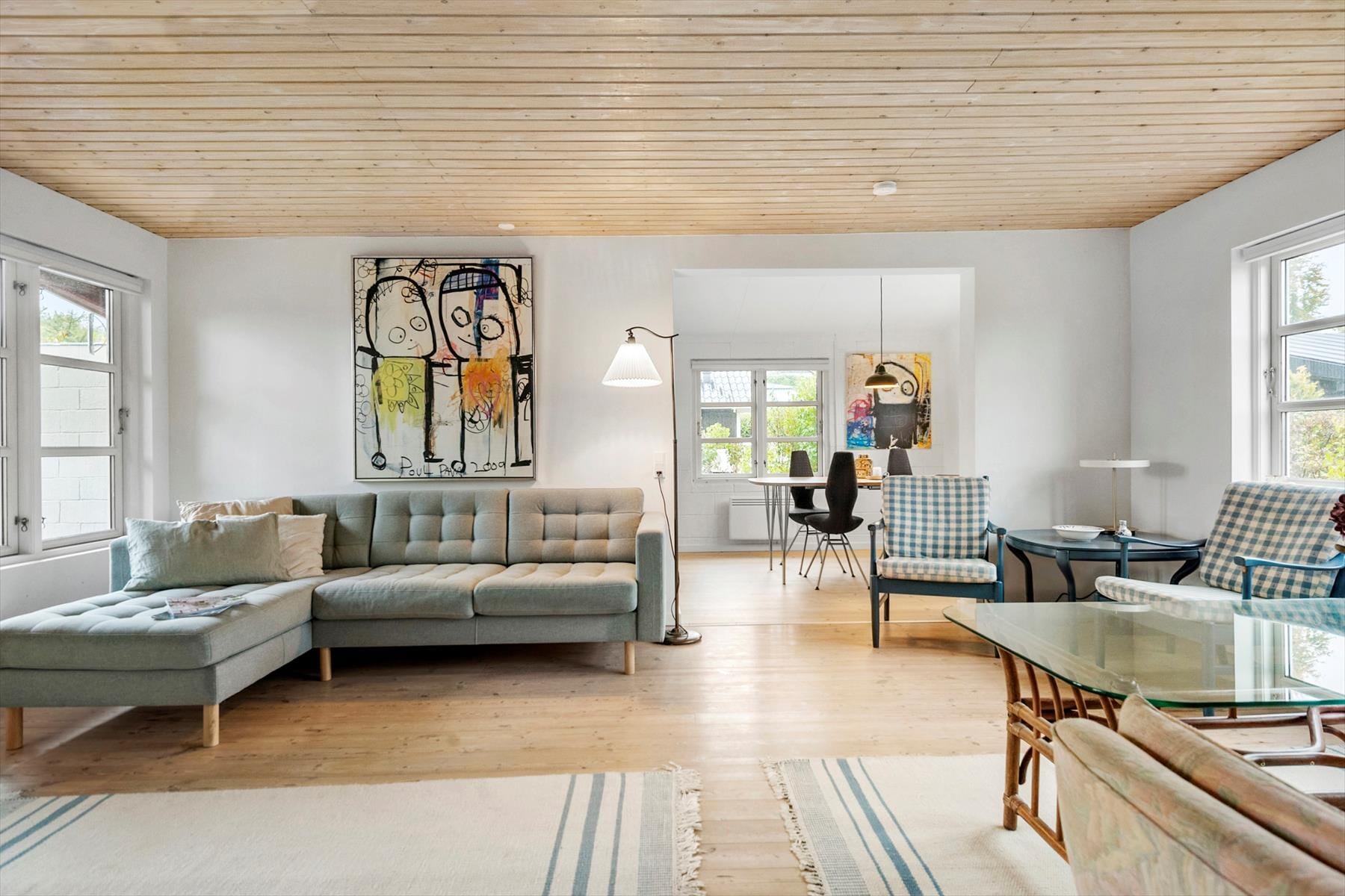 Sobald du das Haus betrittst, spürst du die entspannte Atmosphäre, die dich sofort zur Ruhe kommen lässt. Licht fällt durch die großen Fenster und durchflutet die Räume und die helle Einrichtung sorgt für eine freundliche, behagliche Stimmung. Hier findest du alles, was du brauchst, um dich wie zu Hause zu fühlen – einen offenen Wohnbereich, in dem Küche und Wohnzimmer harmonisch ineinander übergehen und viel Platz, um gemeinsam zu kochen, zu essen oder den Tag Revue passieren zu lassen. Es ist ein Ort, an dem Urlaubsgefühl entsteht, sobald du eintrittst. Mach es dir mit einem Buch gemütlich, hol ein Brettspiel hervor oder genieße einfach die Stille und das leise Summen des Sommers.