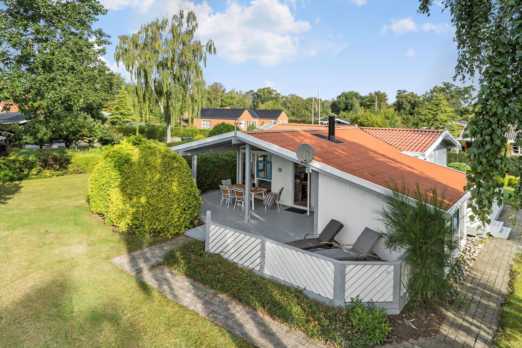 Im sonnigen Garten gibt es viele Bäume und Büsche. Außerdem bietet er zwei Holzterrassen. Die eine ist offen und die andere geschlossen.