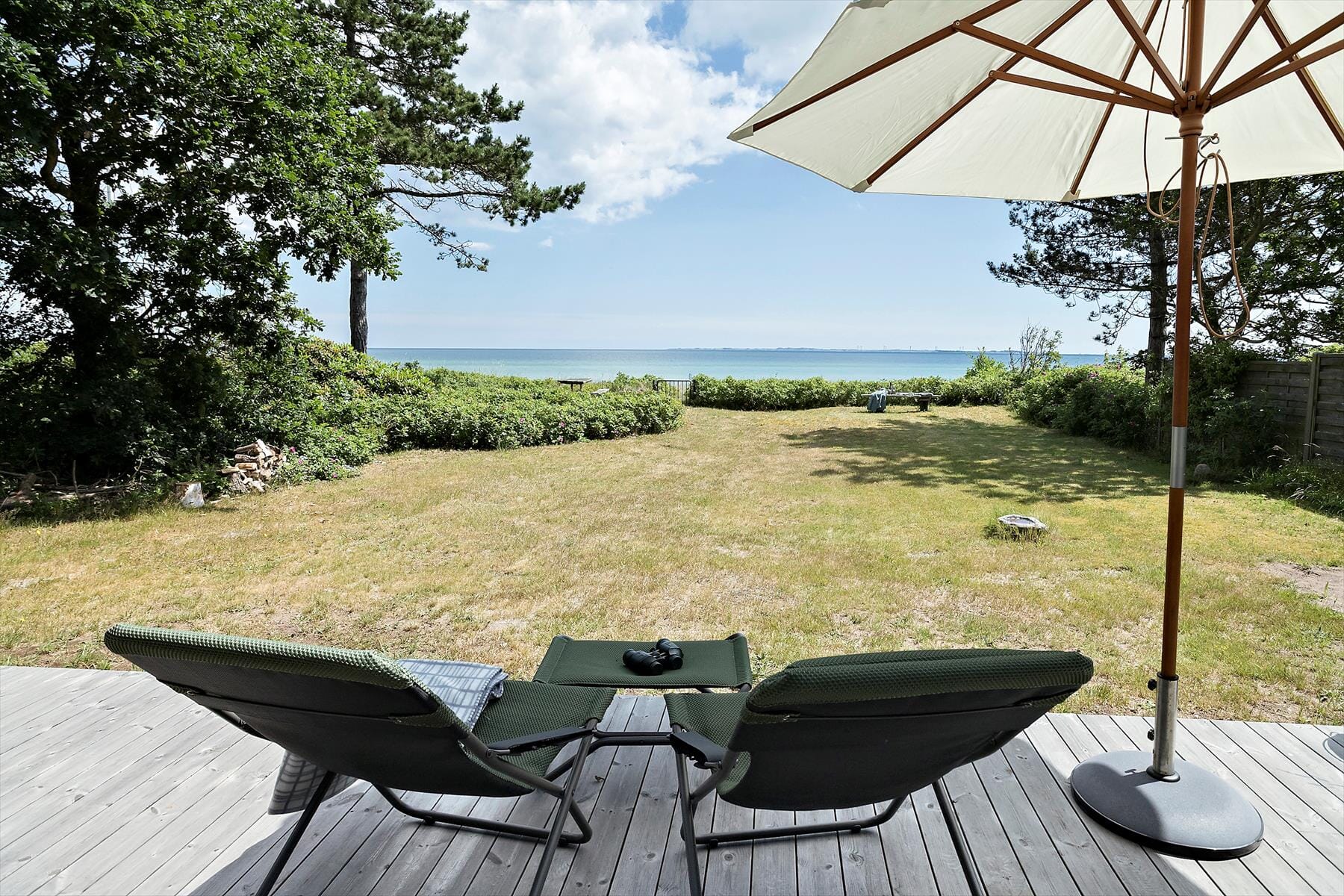 Wenn Sie sich nicht den gesamten Tag hindurch am wohl besten Badestrand Ostjütlands aufhalten möchten, bietet Ihnen die schöne Holzterrasse mit Gartenmöbeln, Liegestühlen und vielem mehr schöne Möglichkeiten, das Wetter, die Lage und das Beisammensein zu genießen.