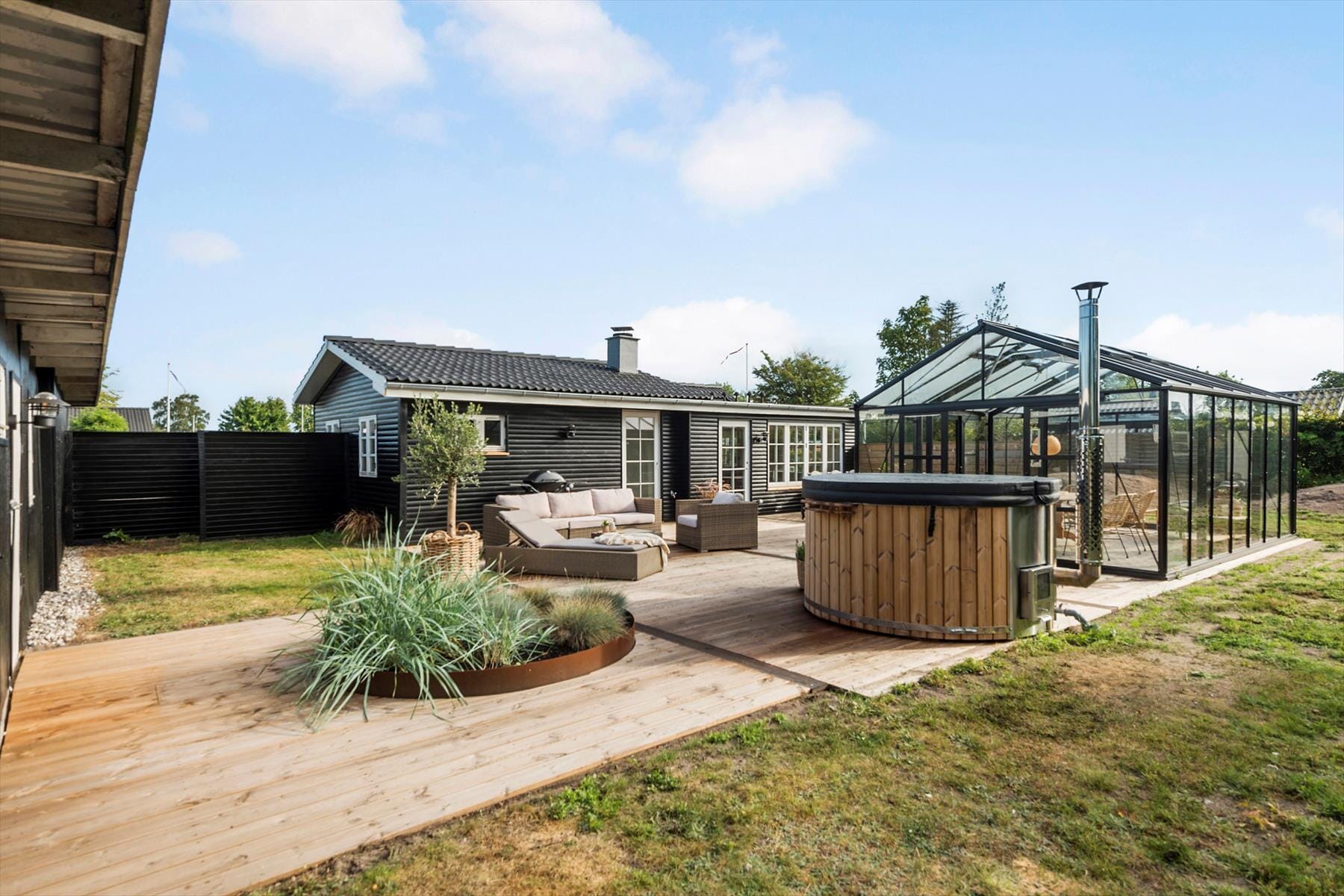 Ein besonderes Highlight ist das Orangerie – ein kleiner Rückzugsort im Garten. Hier kannst du mit einem Glas Wein sitzen und den Sonnenuntergang durch die Glasfenster betrachten, dem Regen lauschen, der sanft auf das Dach fällt, oder einfach die Stille genießen, während die Zeit stehen bleibt. Der Garten bietet Platz für spielende Kinder und Ruhe für die Erwachsenen, und mit dem Strand in Gehweite ist ein spontaner Ausflug ans Wasser immer möglich.