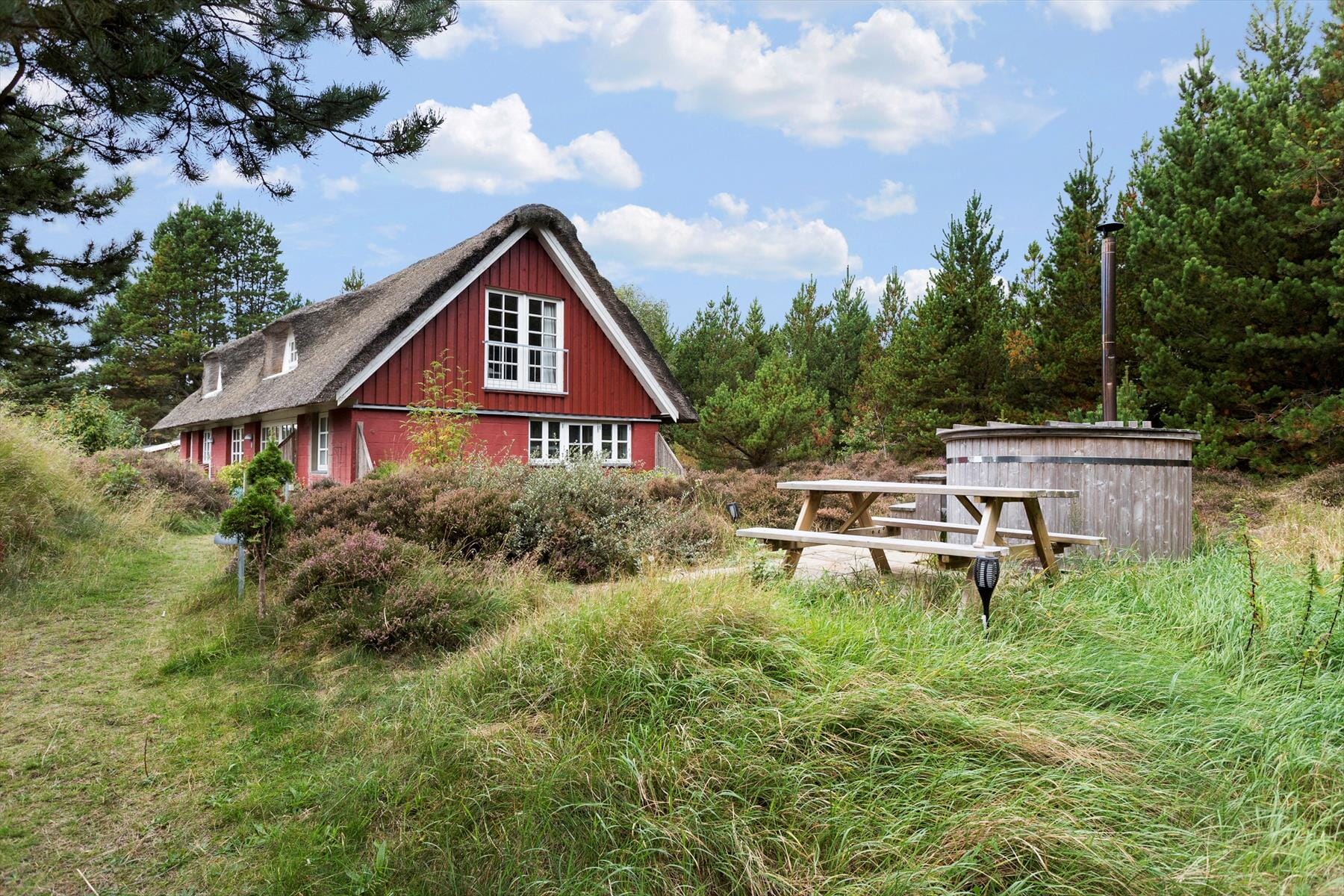 Haus-ID: 0140Du bist umgeben von der schönsten Natur, wenn du deine Ferien in diesem tollen Ferienhaus verbringst. Wenn du in der beheizbaren Badetonne im Garten sitzt oder sonnenbadest auf der Terrasse, kannst du die Aussicht über die Heide, die Fichten und den blauen Himmel genießen.