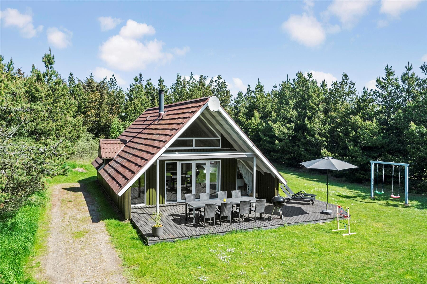 Das Ferienhaus liegt auf einem 1.500 m² großen Grundstück, das von allen Seiten von Tannen umgeben ist. Darum kannst du dich draußen ganz frei bewegen, ganz gleich, ob du dich auf der teilweise überdachten Südterrasse sonnst, Fußball spielst, schaukelst oder auf dem Rasen Purzelbäume schlägst.