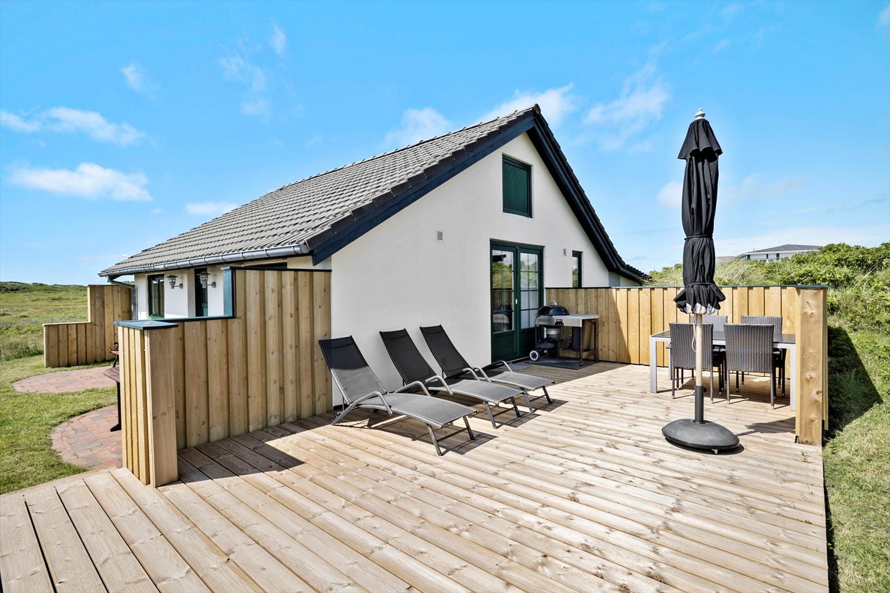 Du wohnst am Ende eines kleinen Weges und wirst mit einem Ausblick über die offene Dünenlandschaft verwöhnt – näher kannst du dem Strand von Lakolk kaum kommen.