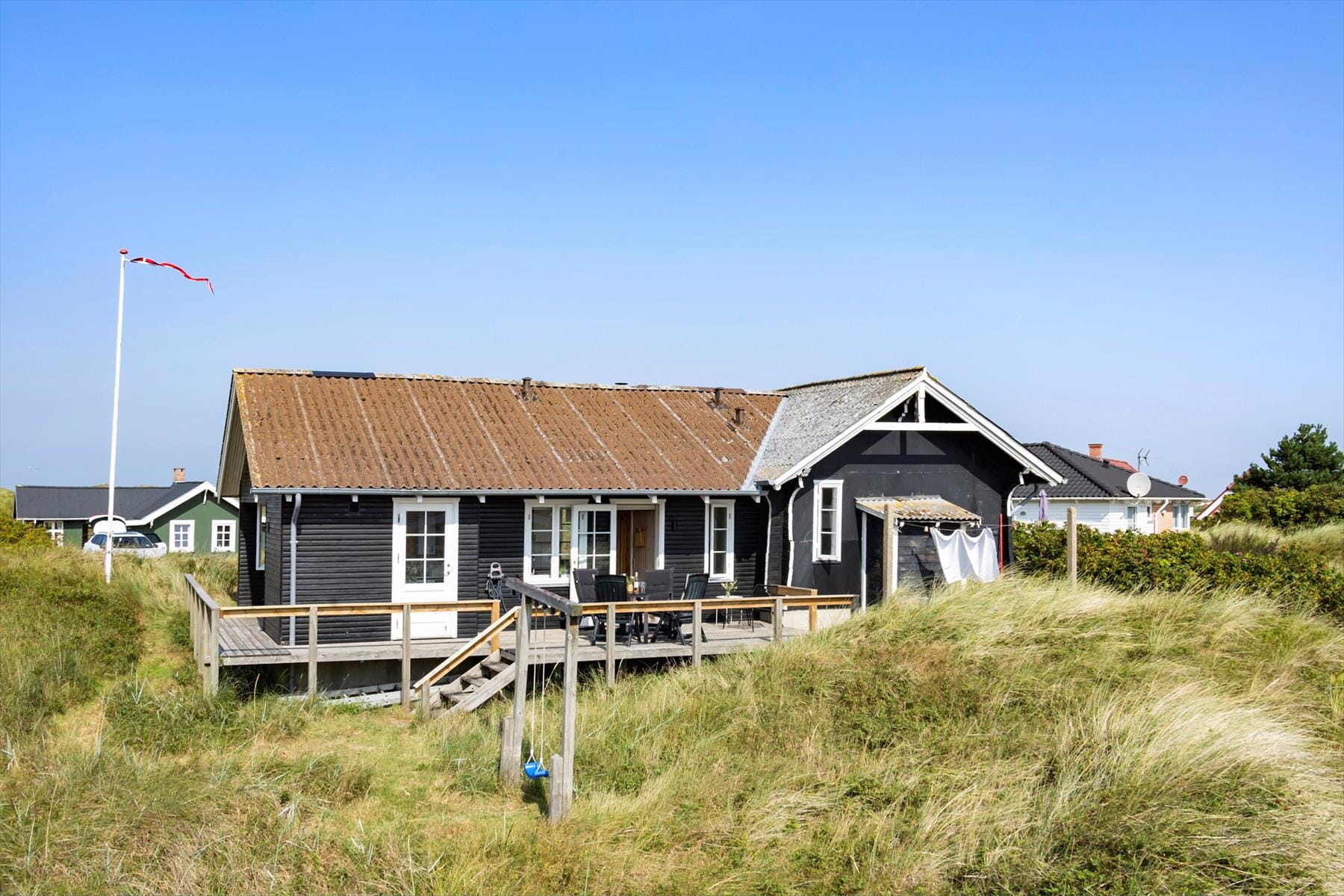 Das Ferienhausgebiet ist von Strandhafer und anderen Küstenpflanzen umgeben. Selbst wenn du den Großteil deines Urlaubs auf einem Gartenstuhl auf der Terrasse verbringst, wirst du merken, dass du nur wenige hundert Meter vom Strand entfernt bist. Das Naturgrundstück ist hügelig, sodass die Holzterrasse an der Ostseite des Ferienhauses etwas erhöht ist, und eine Treppe führt hinunter zu einer Schaukel für die Kinder. Auf der Terrasse kannst du zwischen überdachten und offenen Sitzbereichen wählen, inklusive einer gemütlichen Ecke mit Fenstern nach Westen, wo du windgeschützt sitzen und gleichzeitig das wunderschöne Licht und die friedliche Umgebung genießen kannst.
