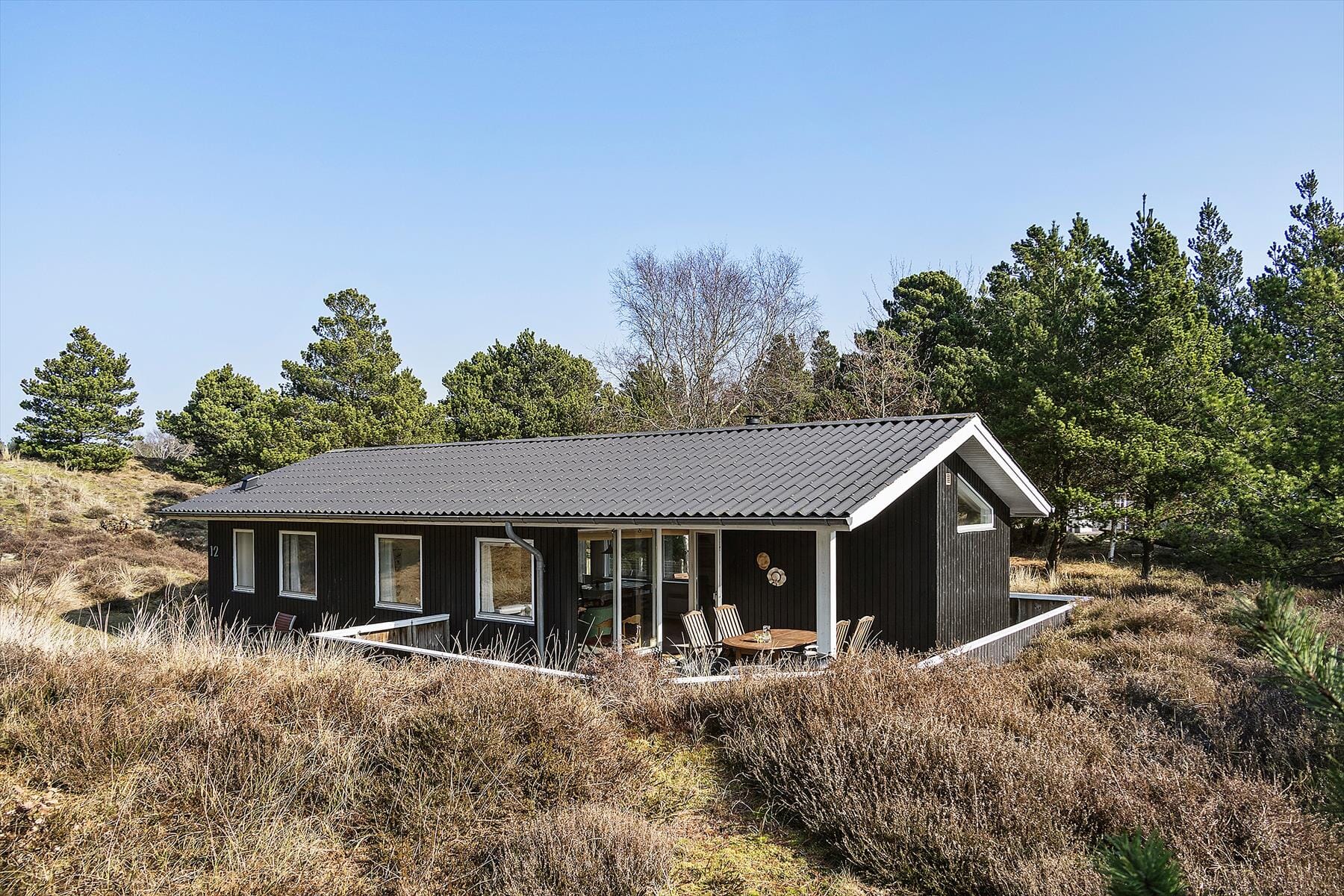 In diesem Ferienhaus wohnst du hautnah in der Natur. Der geschützte Garten ist ein friedlicher Rückzugsort, wo du deinen Morgenkaf fee auf der Terrasse mit Blick auf die umgebenden Bäume und die reiche Flora genießen kannst. Um dich herum verbreitet sich der Duft von Heide in der frischen Luft, und das Zwitschern der Vögel vermittelt ein Gefühl von Ruhe und Besinnung. Abends kannst du zusehen, wie die Sonne hinter den dichten Kiefern untergeht, während du und deine Lieben euch entspannt und die Gemeinsamkeit unter freiem Himmel genießt.