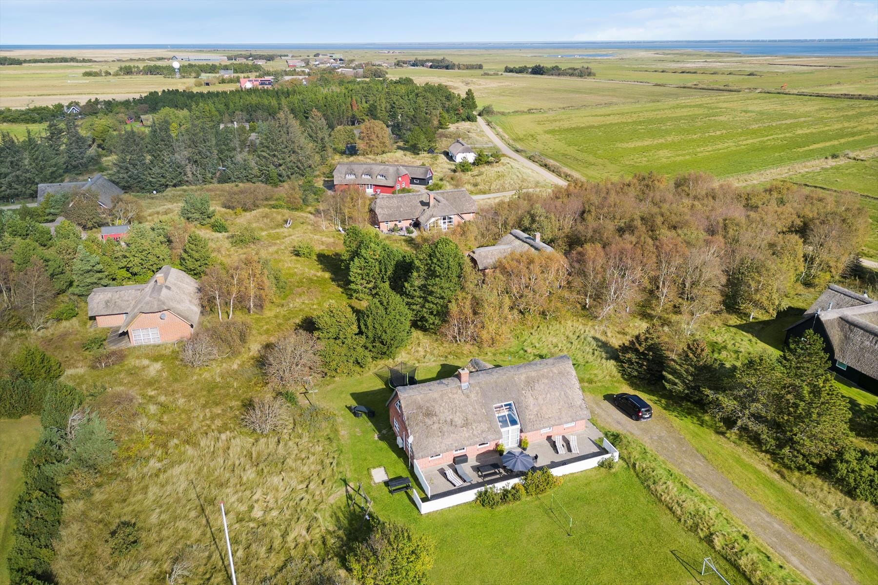 Die große, nach Süden ausgerichtete Terrasse lädt zu vielen gemütlichen Stunden in der Sonne oder beim Grillen ein. Rund um das Haus kannst du dich auf der großen Rasenfläche austoben, die alle Einrichtungen für Fußball, Badminton und Cricket bietet. Du kannst auf dem Trampolin springen, im Sandkasten spielen oder auf den Schaukeln schwingen. Thadesvej 14 ist wirklich ein wunderbarer Ort für einen Familienurlaub.