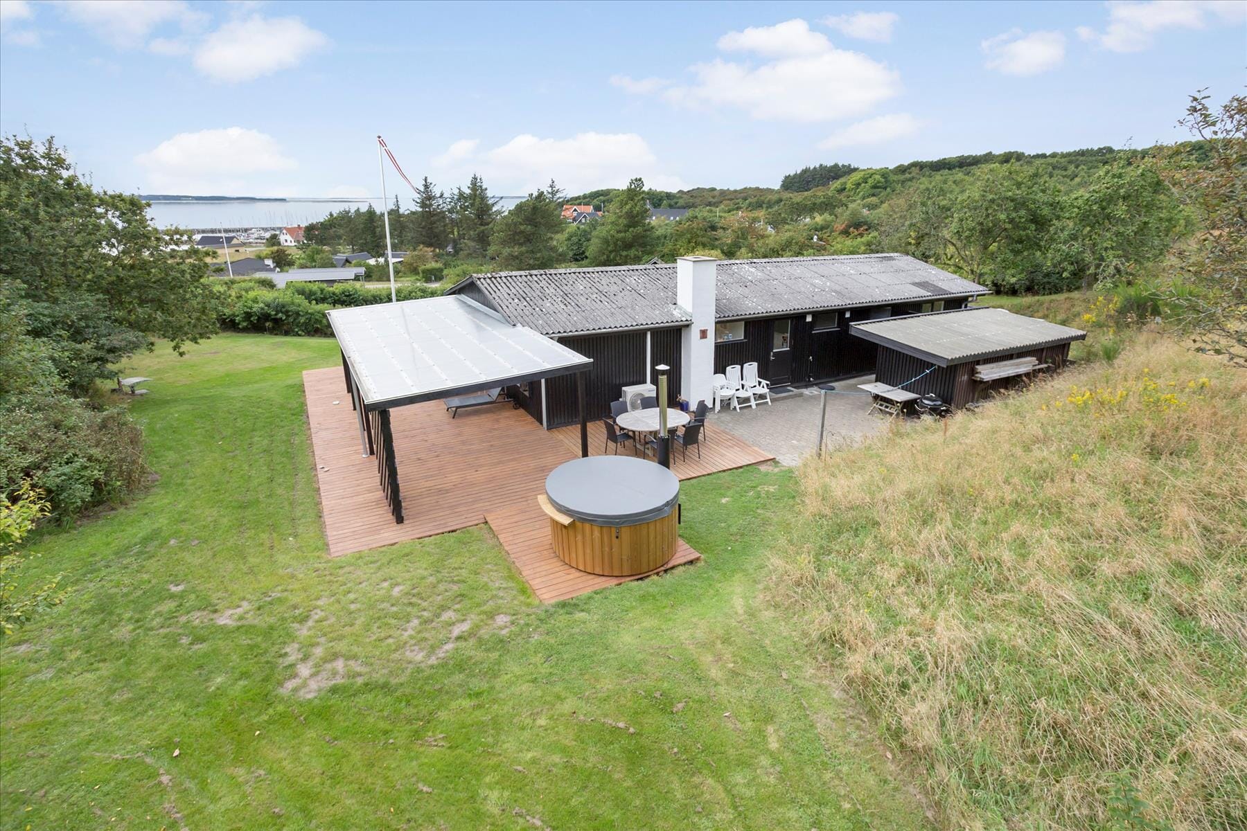 Nicht nur der Wohnraum, sondern selbst zwei der Schlafzimmer verwöhnen mit einem direkten Zugang zur Terrasse, auf der Sie Sonnenbäder und gemeinsame Mahlzeiten unter freiem Himmel genießen. An die Südseite des Mietobjektes schmiegt sich ein großes, überdachtes Terrassenareal, das ebenfalls einen hervorragenden Fjordblick bietet. Selbst die Schwedische Badetonne im Garten ist so platziert, dass Sie auf den Fjord und den Hafen blicken, während Sie sich im warmen Wasser entspannen - luxuriöse Wohlfühlmomente der Extraklasse!