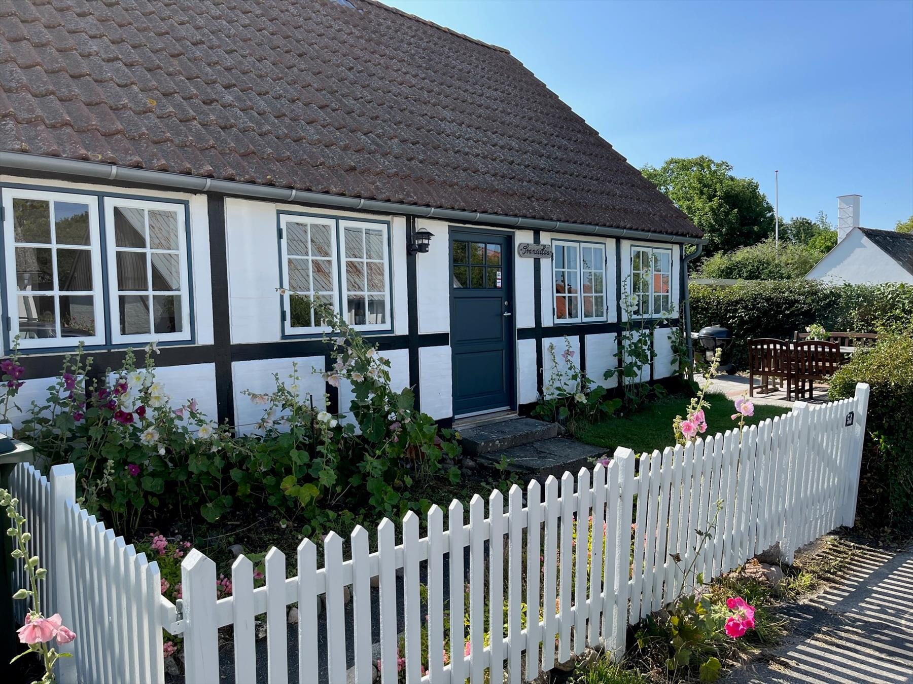 Das alte Dorfhaus im Zentrum von Ørby hat einen kleinen eingezäunten Vorgarten mit Lattenzaun und Bauernrosen, er strahlt echte Dorfidylle aus. An der Nordseite des Hauses befindet sich ein schöner Rasenparkplatz. In einer Ecke des Gartens zur Straße hin gibt es eine kleine geflieste Terrasse mit Heckenbegrenzung und Gartenmöbeln aus Holz. Das Haus hat auch eine schöne, neu angelegte Südterrasse. Der Garten im Westen hinter dem Haus ist eine natürliche Rasenfläche mit einem privaten abgeschlossenen Nebengebäude.