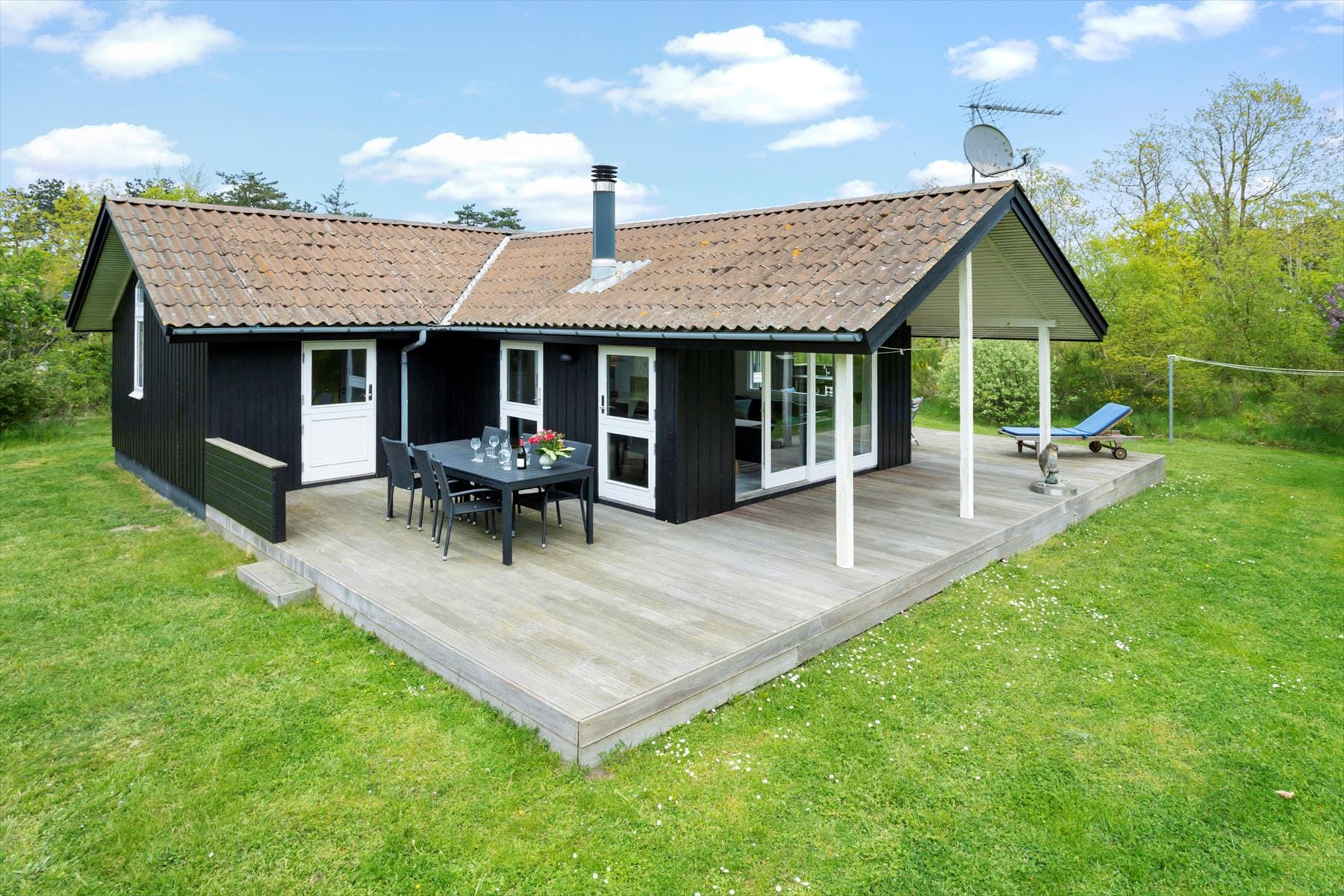 Das Haus ist von einem schönen Garten mit Büschen und Bäumen umgeben, sodass du viel Privatsphäre hast. Im Garten gibt es viel Platz zum Spielen und auf der Wiese stehen mehrere Obstbäume. Im Garten gibt es auch einen schönen Unterstand und eine Feuerstelle, sodass du die Nacht im Freien verbringen oder dich mit deinen Mitreisenden um das Feuer versammeln kannst. Das Haus liegt in der ersten Reihe zum Strand, aber etwas zurückgesetzt hinter Bäumen und Büschen. Ein kleiner Weg führt direkt zum Strand hinunter, sodass du schnell schwimmen gehen oder einen schönen Spaziergang entlang der Küste machen kannst. Um das Haus herum befindet sich eine Holzterrasse, die von der Küche, dem Wohnzimmer und einem Schlafzimmer aus zugänglich ist. Bei der Küche schließt sich eine schöne Ostterrasse an, auf der du sogar deine Mahlzeiten im Freien mit einem fantastischen Blick aufs Wasser zubereiten kannst. Auf der gegenüberliegenden Seite des Ferienhauses befindet sich eine weitere Terrasse, die zum Genießen der schönen Tage und Abende im Freien einlädt.