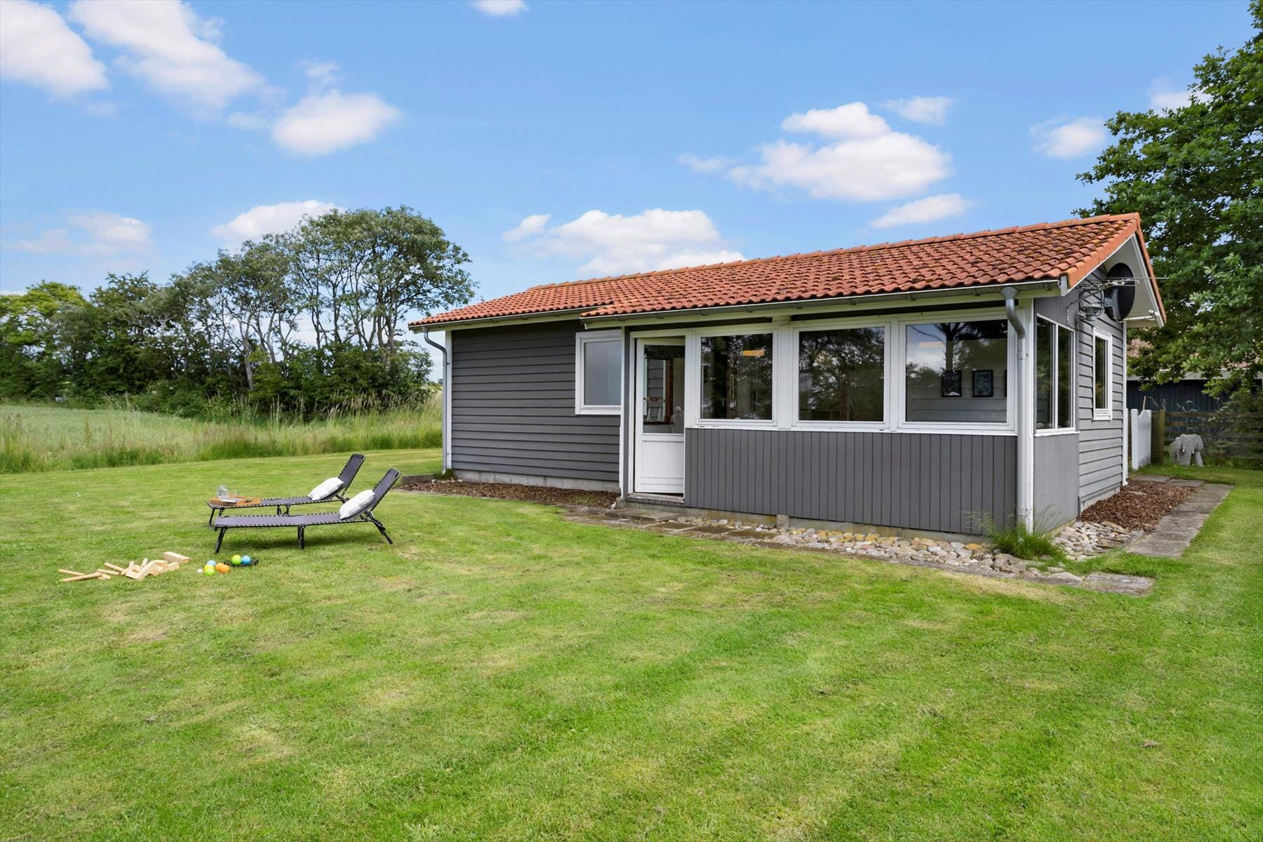Dein Ferienhaus liegt auf einem großen, nach Nordwesten hin offenen Grundstück, das dich mit einem schönen Ausblick über Felder bis auf das Meer verwöhnt. Ein Zaun ist nicht vorhanden. Du genießt die Natur und ruhige Umgebung in vollen Zügen, da dein Haus am äußeren Rand des beschaulichen Ferienhausgebiets Vesterløkken platziert ist. An die östliche Hausseite schließt eine gepflasterte, meist gut vor Wind geschützte Terrasse an, auf der du mit deinen Lieben wunderbar in der Morgensonne frühstücken kannst. Vom Wintergarten an der Westseite trittst du direkt hinaus in den Garten, in dem eine große Grasfläche zum Spielen und Umhertollen und Sonnenliegen zu entspannten Stunden an der frischen Luft einladen.