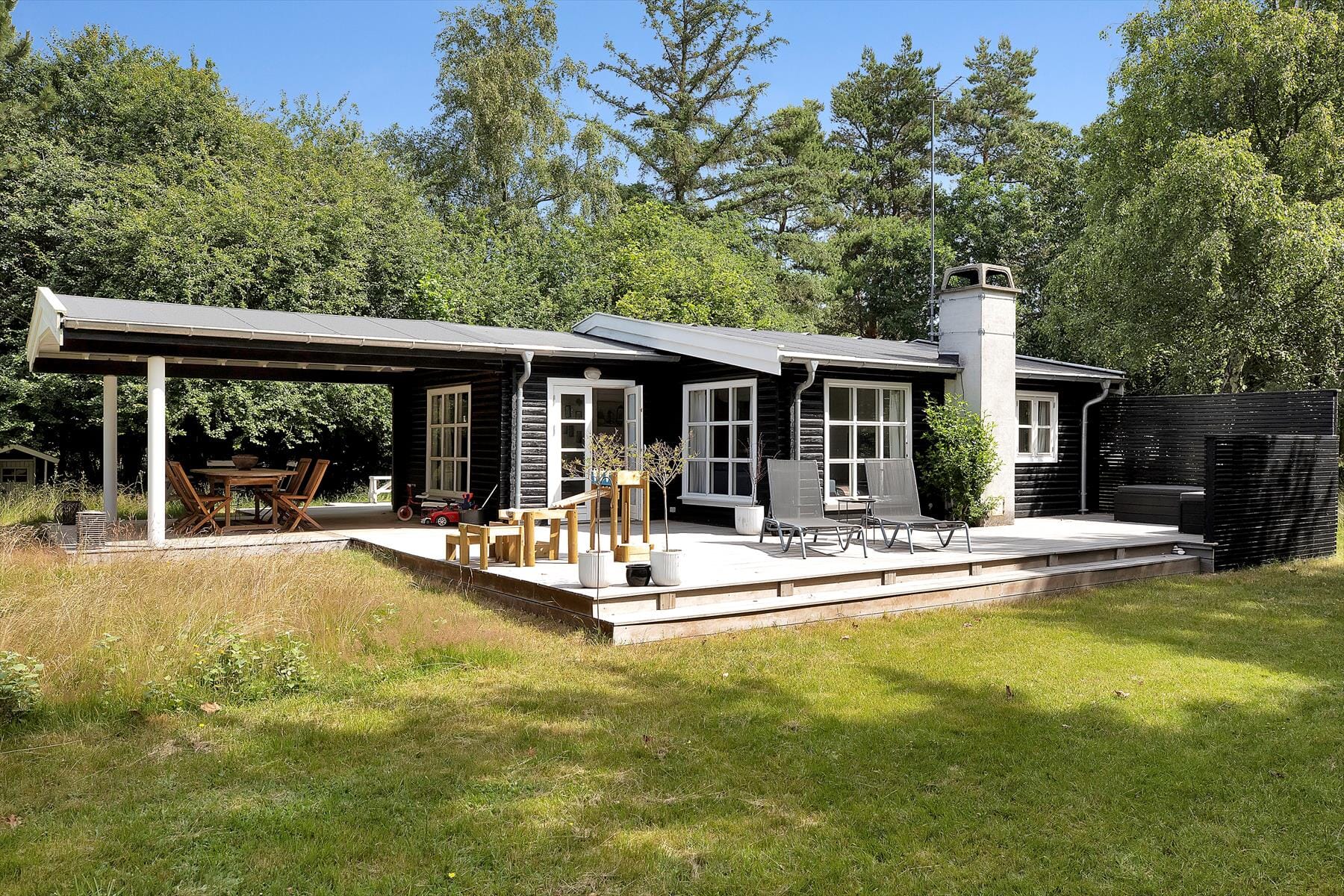 Das Ferienhaus ist mit einem schönen Wohnraum ausgestattet, wo Sie sich in einem guten Buch vertiefen können und einen Kaffee genießen. In Verbindung mit dem Wohnraum haben Sie eine gemütliche Küche, und hier können Sie sich alle damit helfen, einen leckeren Lunch zu vorbereiten. Es gibt ein tolles Badezimmer mit Dusche und drei Schlafzimmer plus ein Nebengebäude mit zwei Schlafplätzen. Die Terrasse ist wirklich fantastisch; die ist in mehreren überdeckten und offenen Sektionen aufgeteilt, und hier können Sie grillen oder ganz einfach die Sonne ab Morgen bis Abend genießen. Es gibt auch eine Außenküche und Außendusche. Möglichkeit die Bluetooth Lautsprecher und Chromecast durch Ihr eigenes Abonnement zu benutzen.