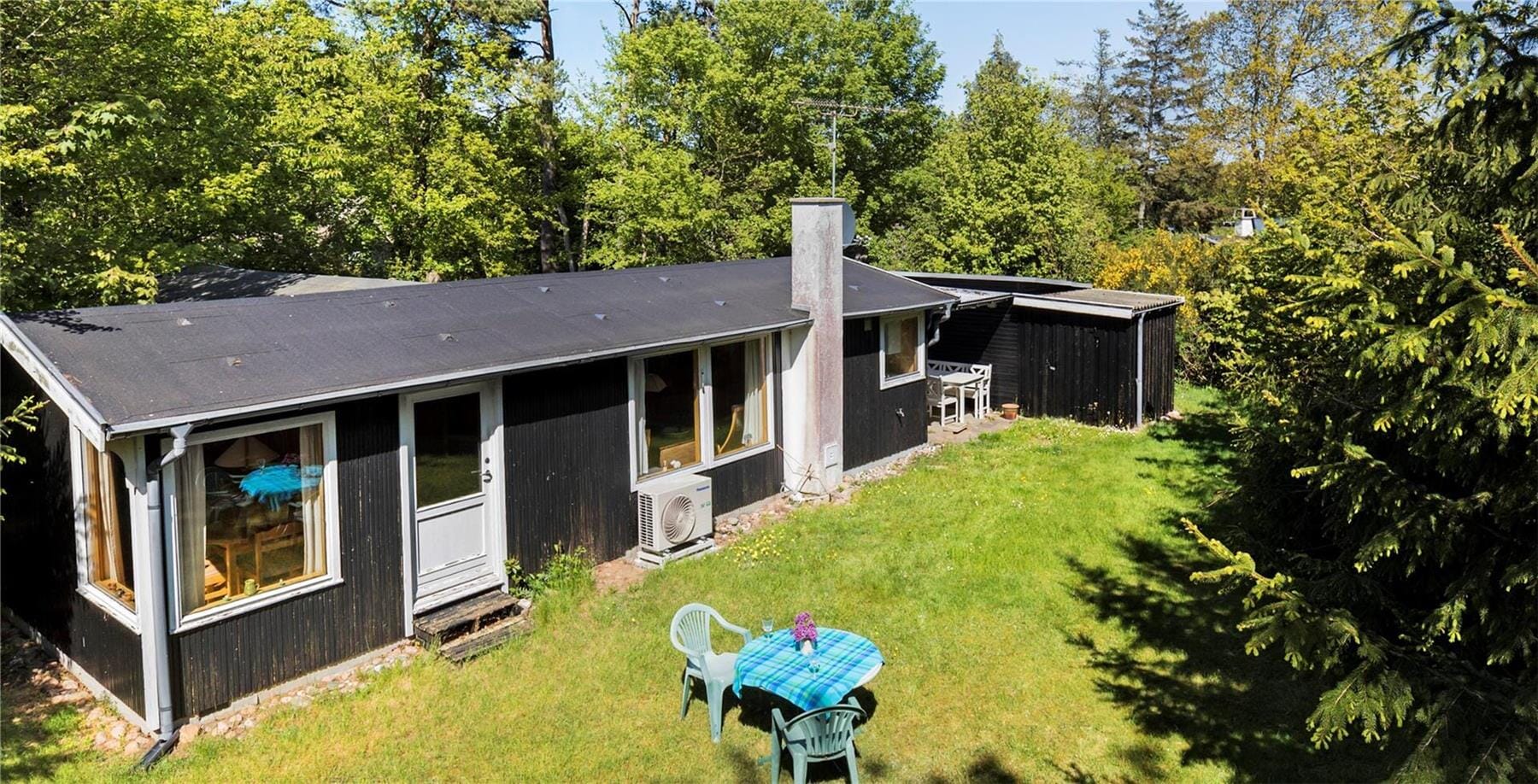 Von der Küche gelangst du durch eine zweigeteilte "Klöntür" hinaus auf die überdachte Terrasse mit einer weißen, stabilen Tischgarnitur. Hier werdet ihr garantiert viele eurer Mahlzeiten genießen! Auf der Rasenfläche stehen ebenfalls Gartenmöbel zur Verfügung. Ihr erholt euch in angenehm ungestörter Umgebung mit Blick auf die hohen Bäume, die das Grundstück umgeben, und lauscht in aller Ruhe dem fröhlichen Gezwitscher der Vögel. Mit ein wenig Glück beobachtet ihr früh am Morgen oder in der Dämmerung das ein oder andere Reh und vergnügt spielende Eichhörnchen.
