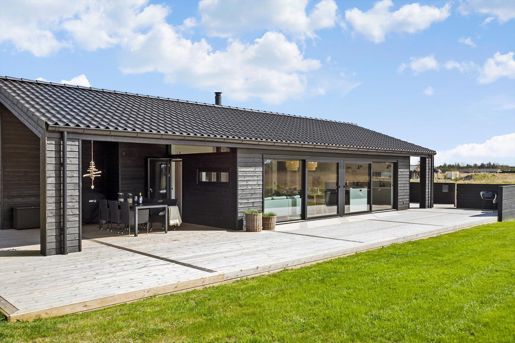 Eine große Holzterrasse führt rund um das Ferienhaus herum, sodass es leicht ist, einen Sonnenstrahl zu finden – oder ein schattiges Plätzchen in einem der überdachten Bereiche zu wählen. Hier am Ende der Straße hast du Ruhe und Frieden um dich herum, und es ist schön, direkt auf die Bäume und die offenen Felder schauen zu können. Ein solch herrlicher Ausblick ist mit Sicherheit Balsam für Körper und Seele! Auch ein morgendliches Bad unter der Außendusche kann Wunder bewirken, wenn du dich gleichzeitig naturverbunden und erfrischt fühlen möchtest. Das Trampolin wird die Kinder begeistern, während die Tore auf dem Rasen die ganze Familie zu einem Spiel einladen.