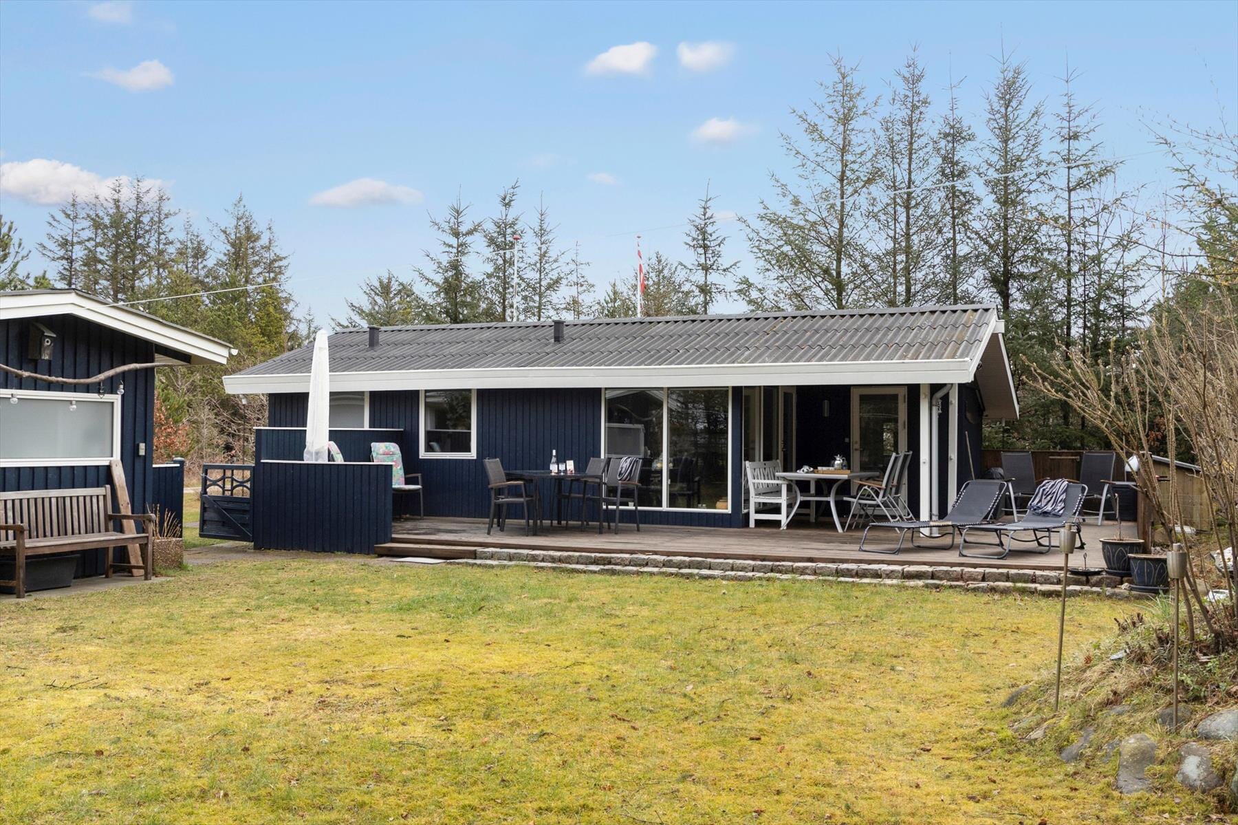Das Leben im Freien entfaltet sich hier in voller Pracht, denn die große südwestlich ausgerichtete Terrasse lädt zu langen, sonnigen Tagen und lauen Sommerabenden ein. Beginne den Morgen mit einer Tasse Kaffee in der Sonne und lass den Tag mit einem Buch im Schatten oder einem entspannten Mittagsschlaf ausklingen. Mehrere gemütliche Ecken bieten immer einen windgeschützten oder sonnigen Platz – ganz nach Wunsch. Wenn der Hunger kommt, kann der Grill angezündet werden, und das Abendessen wird unter freiem Himmel mit frischer Meeresluft genossen. Die große Rasenfläche bietet viel Platz zum Spielen und Entspannen, während die Kinder sich frei bewegen können. Hier findet man Ruhe und Zeit zum Innehalten.
