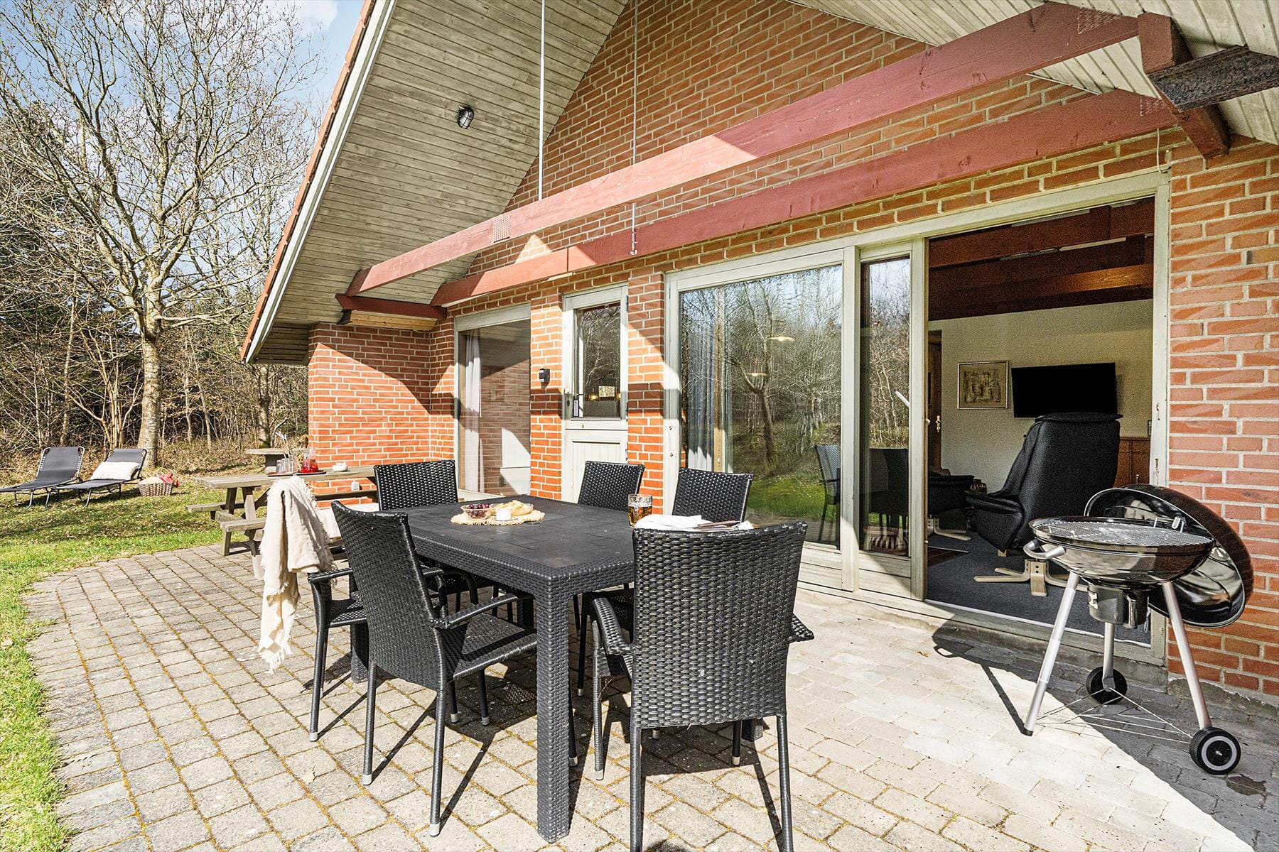 Auf der südlichen Seite des Hauses liegt die teilweise überdachte Terrasse mit Gartenmöbeln und Liegestühlen. Das 2.500 m² große Naturgrundstück ist zum Großteil mit verschiedenen Laubbäumen bepflanzt, welche Windschutz bieten und das Haus vor neugierigen Blicken schützen. Dennoch ist die Möglichkeit gegeben, auf der Terrasse in der Sonne zu sitzen. Im Garten können die Kinder sich nach Herzenslust austoben und Sie können an einem schattigen Plätzchen unter den Bäumen mittagessen. Im Haus und auf der Terrasse sind Sie sich ihrer Privatsphäre gewiss. Zudem können Sie Ihr Auto gleich neben dem Haus parken.