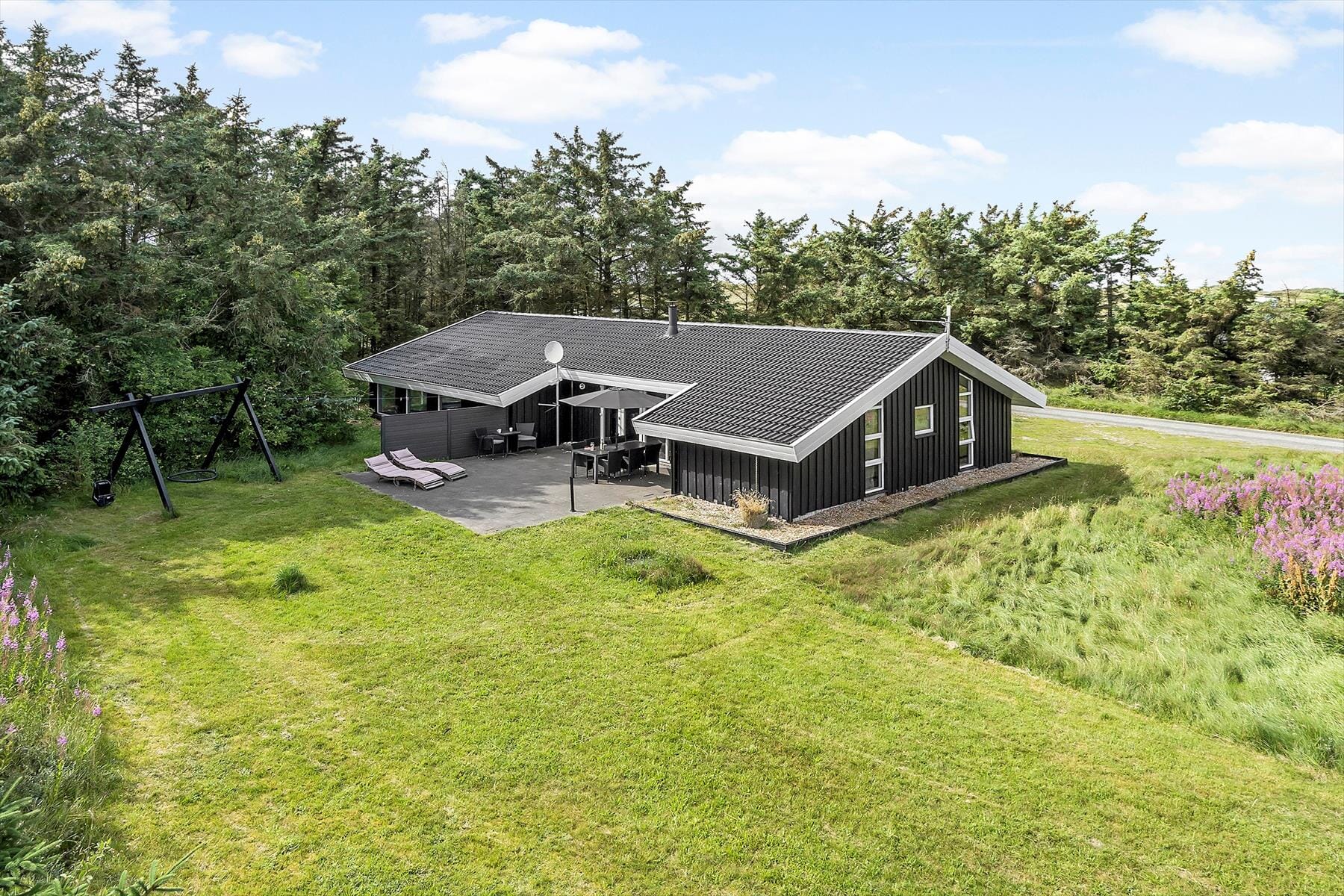 Schöne Stunden im Freien genießen Sie auf der Südterrasse. Die Terrasse ist durch den üppigen Bewuchs des Grundstücks gut vor Wind geschützt. Sie ist gen Südwesten hin offen und verwöhnt den gesamten Tag über mit Sonne und einem schönen Ausblick. Die Terrasse bietet ausreichend Platz für die Liegestühle und für ein gemütliches Abendessen vom Grill. Für die Jüngsten steht eine Schaukel zur Verfügung. Das Grundstück bietet viel Platz zum Spielen und Umhertollen. Das angrenzende Waldstück lädt zu Erkundungstouren und zum Bauen von Höhlen ein.