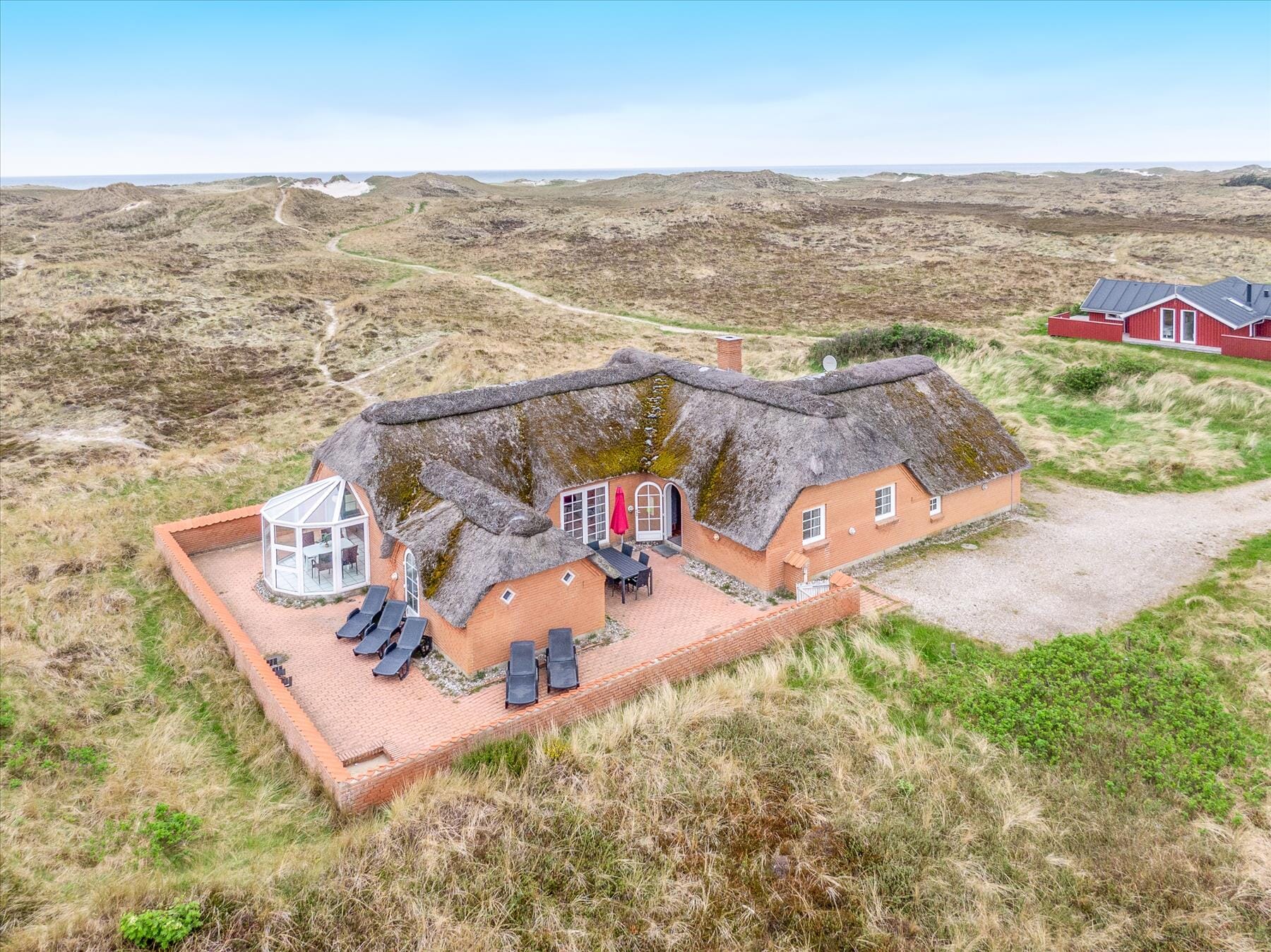 Wenn Sie lieber unter freiem Himmel bleiben möchten, können Sie sich auf die große Terrassenlandschaft begeben, die einen Südteil und einen nach Osten ausgerichteten Innenhof aufweist. Die Terrasse ist von einer geschützten Mauer umgeben und bietet viel Platz, um Mahlzeiten in der Sonne zu servieren oder einfach auf den Sonnenliegen zu entspannen. Der Parkplatz des Anwesens bietet Platz für mehrere Autos und das Naturgelände fügt sich nahtlos in die umliegende Natur Westjütlands ein. Als Extra-Service wurde ein CEE 16 Ampere installiert. Stecker zum Laden von Elektroautos. Denken Sie daran, Kabel mitzubringen.