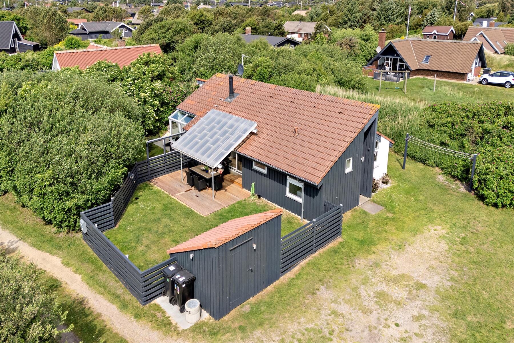 Das Ferienhaus am Hjelmevej 33 bietet sowohl eine überdachte als auch eine geschlossene Terrasse – die Großen können sich zu entspannen, während die Kinder sicher im Garten spielen. Schaukel und Sandkasten werden sicherlich ein Hit für die Jüngsten sein, die stundenlang spielen können. Gleichzeitig könnt ihr die frische Luft und die friedliche Ruhe genießen, die Søndervig auszeichnet. Egal bei welchem Wetter - die Terrasse kann das ganze Jahr über genutzt werden. Unter dem überdachten Teil könnt ihr nämlich geschützt im Trockenen verweilen - mit einem warmen Getränk oder einem guten Glas Wein – und die Kinder können spielen und spielen.