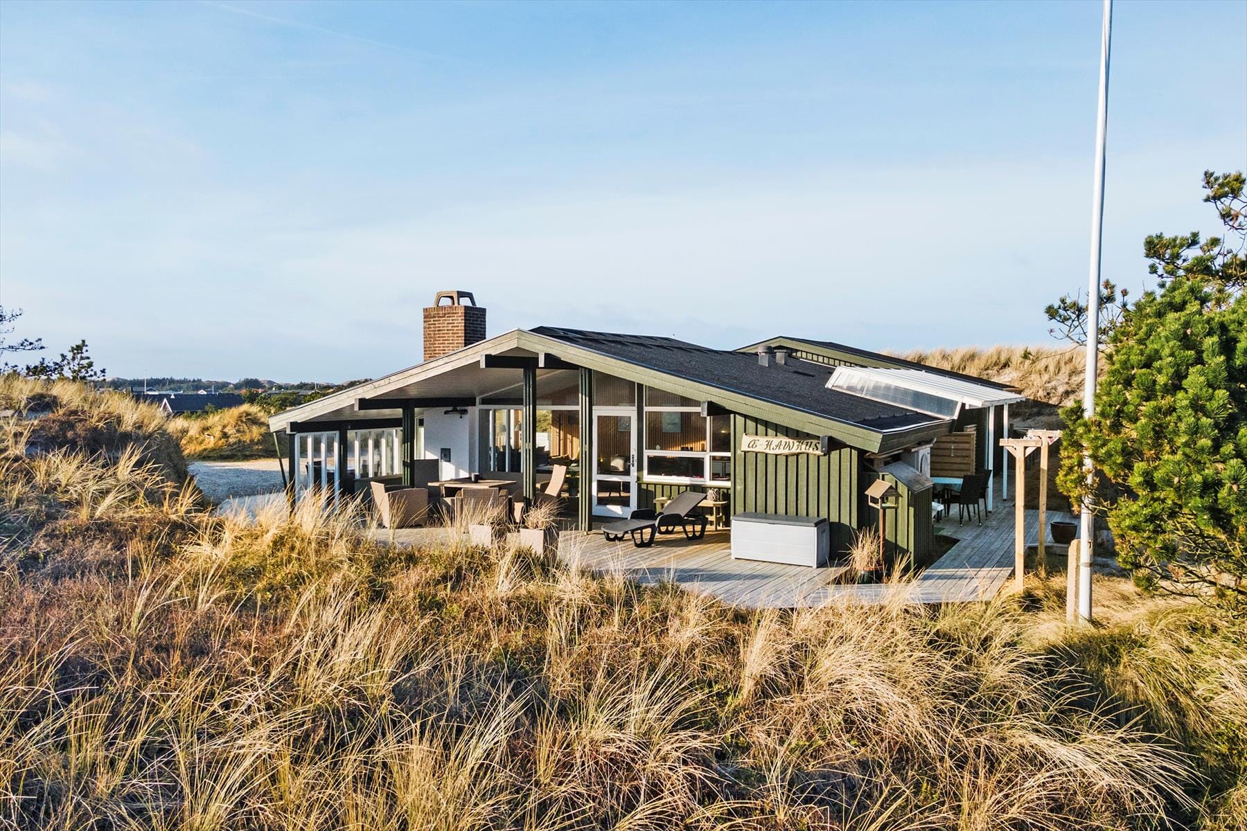 Haus-ID: 1149Willkommen in "Æ Hawhus" - einem großen und stilvollen Ferienhaus, das versteckt in den Dünen, nur 800 Meter abseits des Søndervig Strand liegt. Das Hausinnere bietet viel Platz für sechs Personen. Aufgrund der ungestörten Lage bilden die Terrassen einen herrlichen Rahmen für erholsame Urlaubsstunden im Freien.