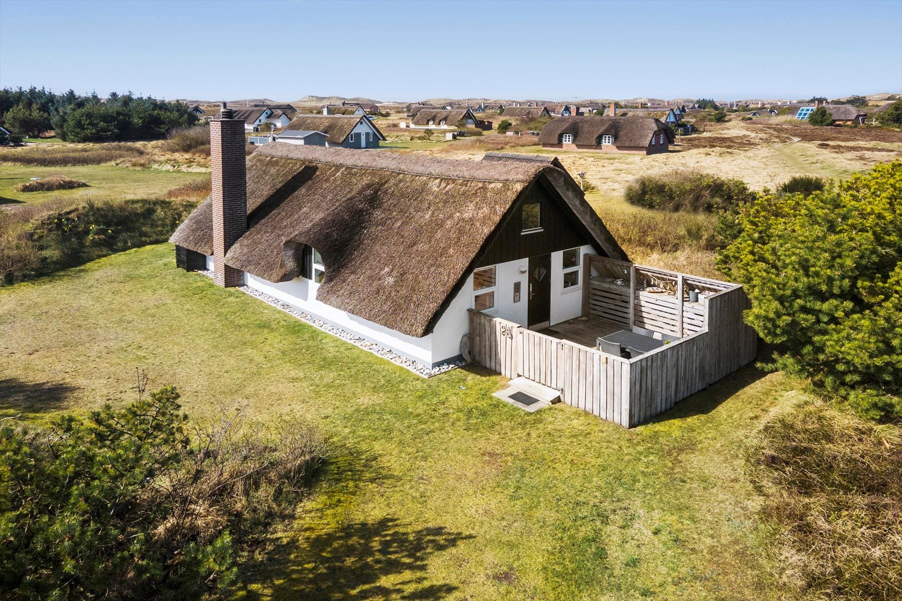 Reetdachhäuser und reizvolle Natur prägen dieses kleine Gebiet, das einen wirklich zauberhaften Rahmen für Ihre Urlaubstage in Klegod bietet. Nach knapp einem Kilometer haben Sie bereits den Nordseestrand erreicht. Ihr Weg ans Wasser führt Sie über ruhige Schotterwege oder kleine Pfade, die sich durch die Heidelandschaft schlängeln. Wenn Sie dem Ringkøbing Fjord einen Besuch abstatten möchten, empfehlen wir Ihnen einen Abstecher in den idyllischen Fjordhafen Lyngvig Havn, der ein wenig weiter südwärts auf Holmsland Klit liegt. Im populären Fischereihafenort Hvide Sande treffen Aktivurlauber auf gute Surfspots, eine Wasserski- und Wakeboardanlage und gute Angelplätze im Hafenbereich. Zügig erreicht ist der nördlich gelegene Badeort Søndervig, der mit guten Lokalitäten, einem riesigen Badeland und einem Golfplatz zu punkten weiß.