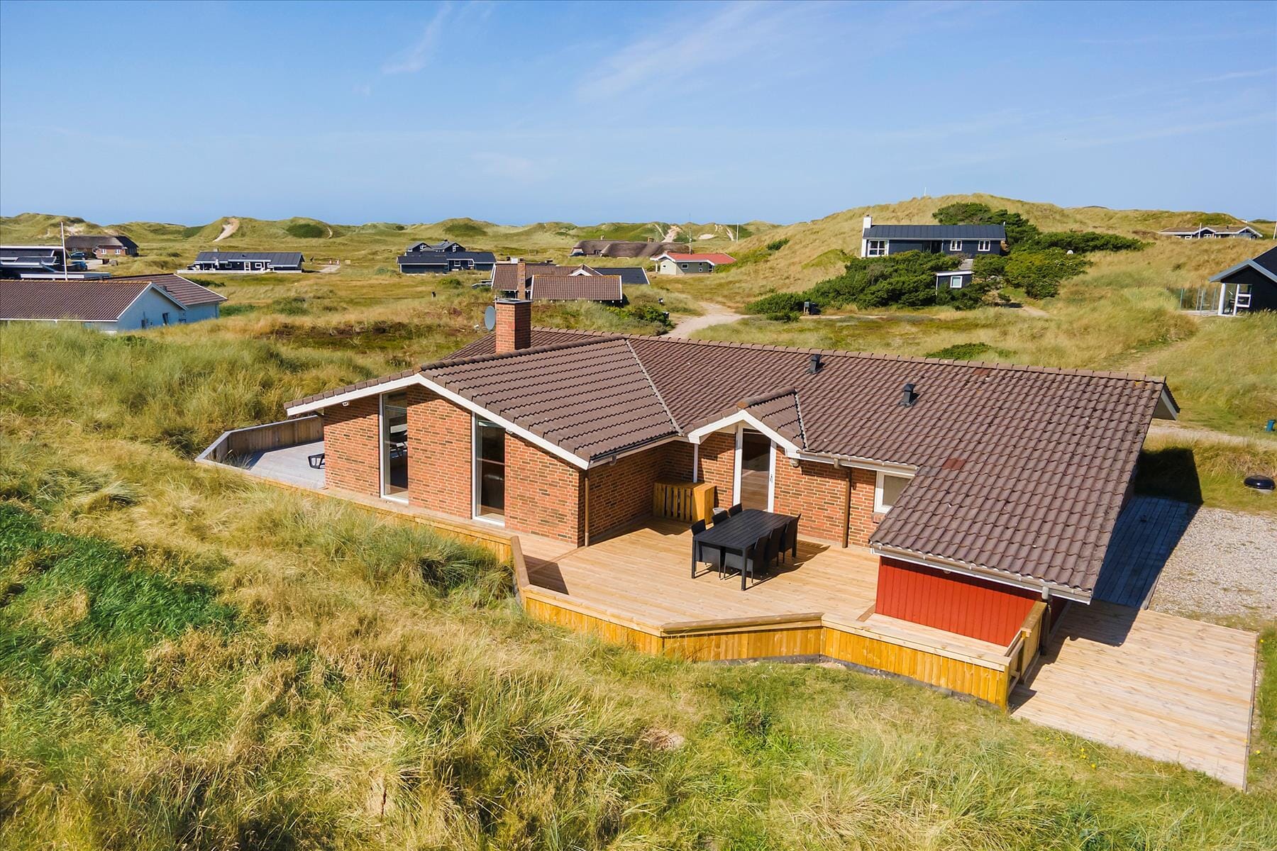 Auch draußen ist viel Platz vorhanden, denn um das Haus herum erstreckt sich eine 100 m² große, geschlossene Terrasse. Ein kleiner Teil ist überdacht, der Rest ist offen gestaltet, damit Sie die Sonne oder einen schönen Abend unter dem Sternenhimmel genießen können. Für die Kinder gibt es Schaukeln. Vom hügeligen Dünengrundstück aus hat man eine schöne Aussicht über die geschwungene Landschaft und den Stadil Fjord.