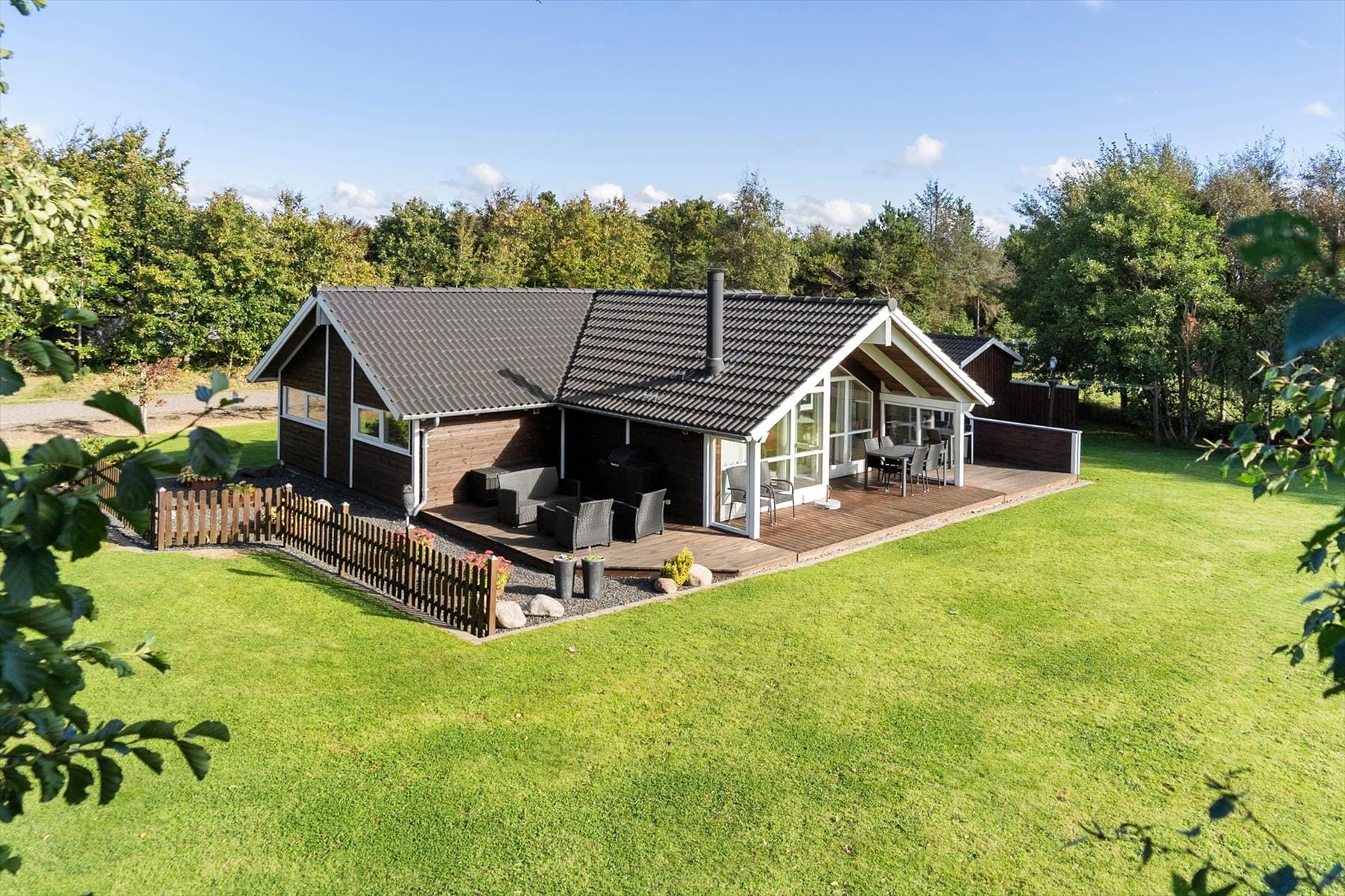 Wenn sich das Wetter von seiner besten Seite zeigt, rückt das Leben draußen schnell in den Mittelpunkt. Die Terrasse des Sommerhauses ist sowohl offen als auch teilweise überdacht, sodass du je nach Stimmung und Tageszeit einen Platz in der Sonne oder im Schatten findest. Hier lassen sich die Mahlzeiten unter freiem Himmel genießen, während der Grill für gemütliche Sommerabende bereitsteht – begleitet vom Duft des Essens und dem Vogelgesang im Hintergrund. Der Garten bietet Raum für Entspannung, Spiel und ruhige Momente mit Blick auf die grünen Umgebung. Die Terrasse wird schnell zum natürlichen Treffpunkt – ganz gleich, ob der Tag mit einem stillen Morgenkaffee beginnt oder mit einem Glas Wein endet, während die Sonne untergeht und den Himmel über Jegindø in weiche, goldene Farben taucht.