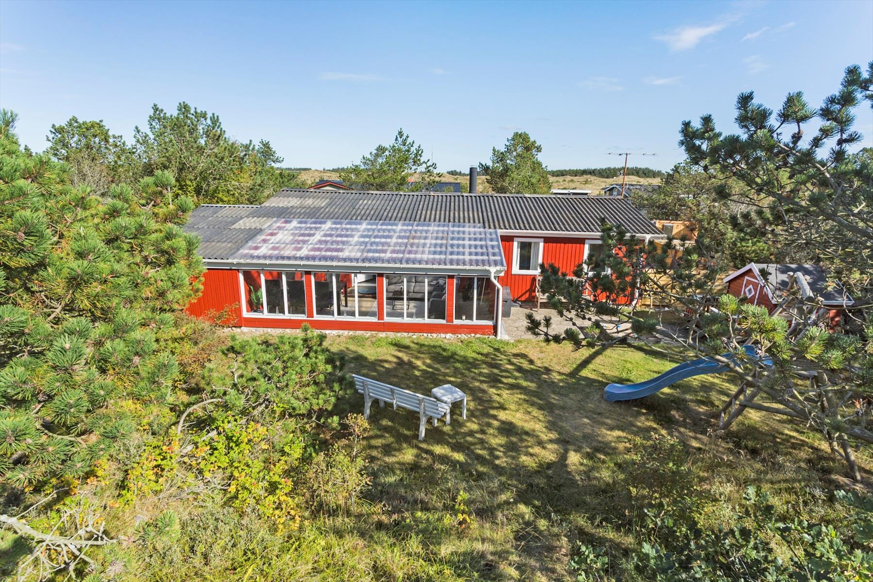 Draußen erwartet Sie ein wunderschönes Naturgrundstück, das zu zahlreichen Aktivitäten im Freien und erholsamen Stunden in der Natur einlädt. Hier können Sie das weiche Gras unter Ihren Füßen spüren und Ihre Sinne von den frischen Düften der umliegenden Natur beleben lassen. Das großzügige Grundstück ist ideal zum Spielen mit den Kindern oder für einen ruhigen Moment mit einer Tasse Kaffee, während Sie Ihren Gedanken freien Lauf lassen. Mit der Möglichkeit, alle Haustiere frei und sicher herumlaufen zu lassen, schafft dieser Ort einen natürlichen Rahmen für den perfekten Urlaub, in dem Spiel und Entspannung Hand in Hand gehen. Stellen Sie sich die hellen Sommerabende vor, an denen der klare Himmel und die Sterne über Vorupør die natürliche Kulisse für lange Gespräche und traumhafte Momente im Freien bilden.