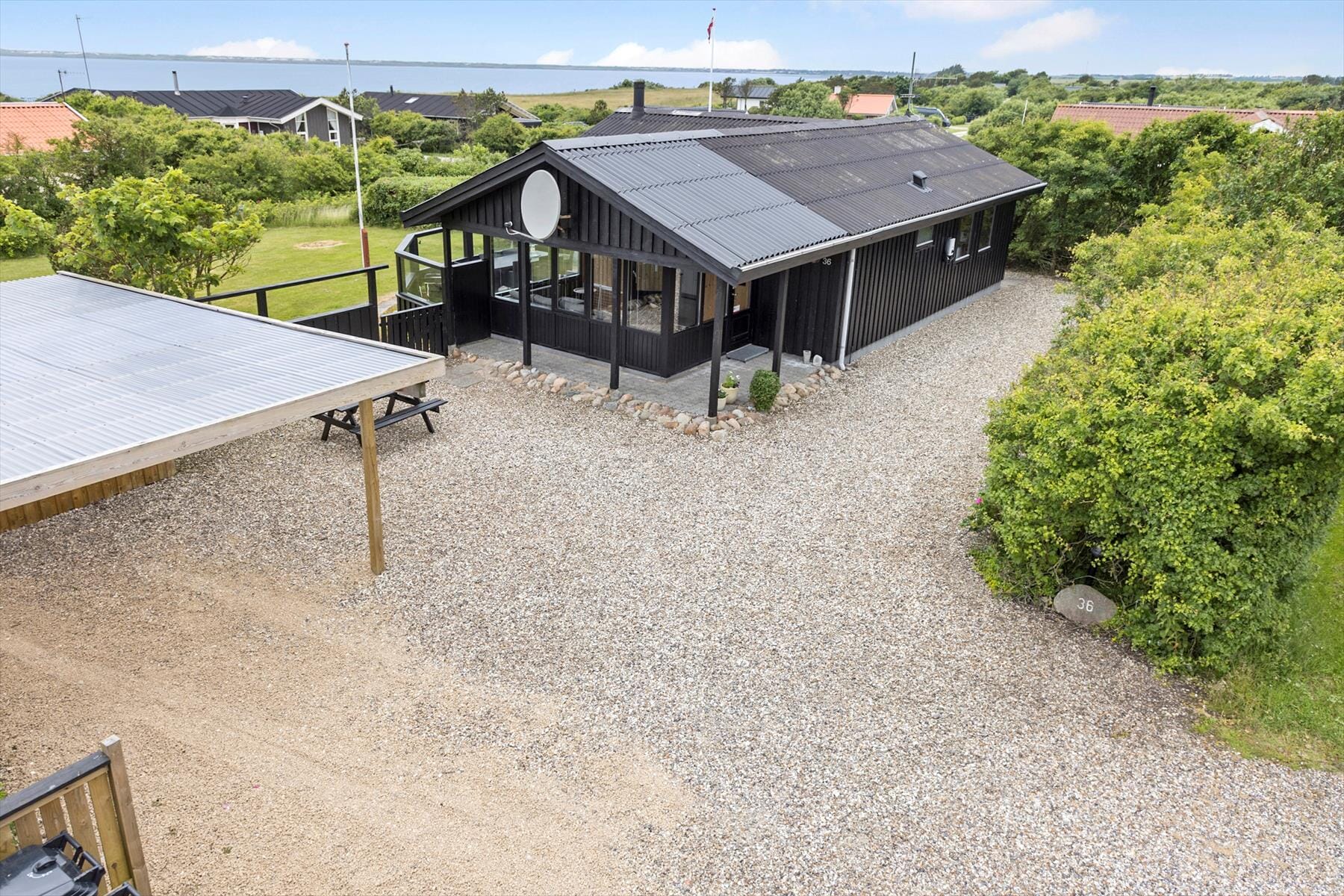 Das Ferienhausgrundstück ist wohl durchdacht angelegt mit einem Carport, einer mit Schotter versehenen Parkfläche, einer gepflegten Grasfläche und einer dichten Randbepflanzung. Die Holzterrasse ist zur Sonne hin ausgerichtet und gut abgeschirmt, sodass absolut nichts gegen traumhaft erholsame Stunden im Freien spricht.