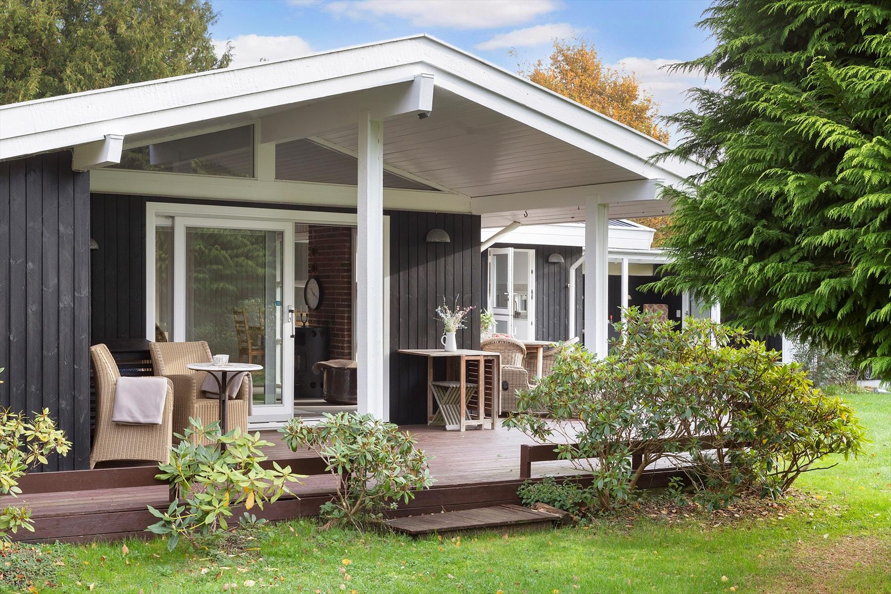 Vom Wohnzimmer gelangst du direkt auf die teilweise überdachte Holzterrasse. Hier kannst du geschützt sitzen, wenn eine Sommerwolke vorbeizieht, oder die Sonne bei einem guten Buch genießen. Der Garten ist grün und ruhig, umgeben von Büschen und Bäumen, die für Privatsphäre sorgen. Auf der Rasenfläche ist Platz zum Spielen, Toben oder einfach zum Faulenzen in der Sonne – während du das Zwitschern der Vögel und die Nähe zum Meer spürst.