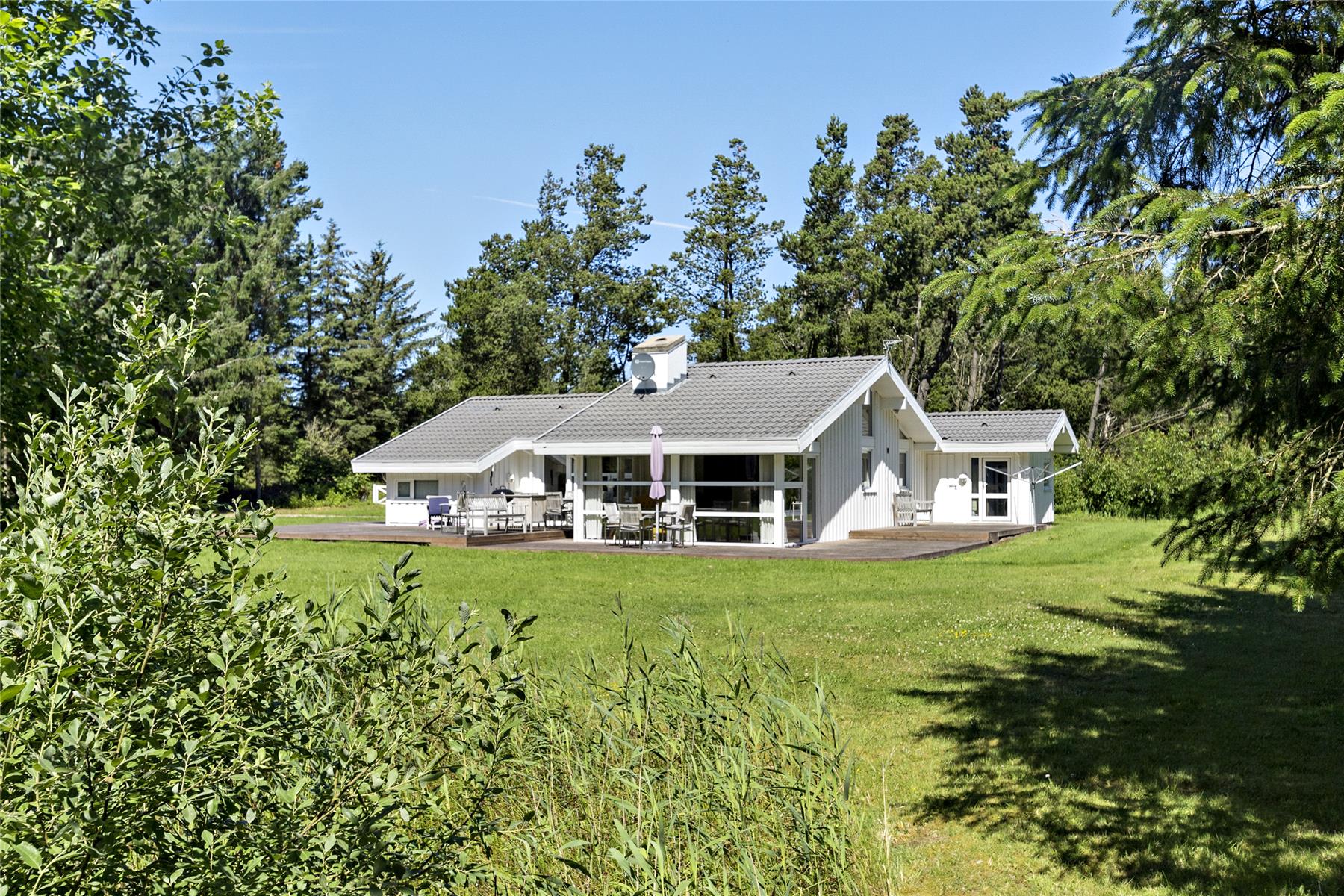 Der große Terrassenbereich des Ferienhauses lädt dazu ein, das Leben im Freien zu genießen. Beginne den Tag mit einer Tasse Kaffee, während die Sonne aufgeht, und beende ihn mit einem köstlichen Essen vom Grill. Der große Rasen bietet reichlich Platz für Ballspiele, Spiele und Aktivitäten für Kinder und Erwachsene. Das Gebiet ist reich an Tierleben, sodass es nicht ungewöhnlich ist, Rehe und Vögel vorbeiziehen zu sehen. Hier ist Platz für Entspannung und Gemeinschaft unter freiem Himmel.