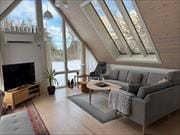 Hier erwarten Sie die besten Voraussetzungen für einen Urlaub voller Gemütlichkeit, gemeinsamer Stunden und schöner Erlebnisse. Das Holzferienhaus ist mit viel Liebe zum Detail eingerichtet und bietet sowohl Entspannung als auch Unterhaltung. Der große Wohnbereich verbindet Küche, Essplatz und Wohnzimmer, sodass alle zusammen sein können – ob beim Kochen, beim Lesen eines Buches oder beim gemütlichen Beisammensein am knisternden Kaminofen mit einer Tasse Kaffee. Am Ende des Wohnzimmers gibt es zusätzlichen Ferienspaß: ein kleiner Bereich mit Billard und Darts – perfekt für spannende Wettkämpfe für Groß und Klein. Hier ist Platz für die ganze Familie, und die Atmosphäre ist herzlich und einladend.