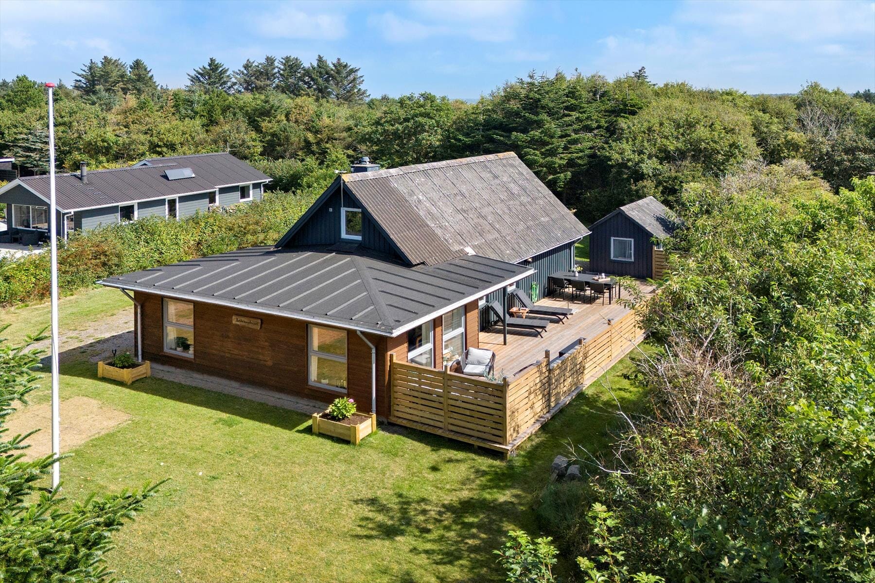 Vom Wohnzimmer aus treten Sie direkt auf die große Holzterrasse hinaus, die den ganzen Tag Sonne bietet. Beginnen Sie den Morgen mit einer frisch gebrühten Tasse Kaffee, genießen Sie ein entspanntes Mittagessen im Freien oder versammeln Sie die Familie am Abend zu einem Grillabend, während Sie die Erlebnisse des Tages Revue passieren lassen. Die Lage lädt dazu ein, vollkommen abzuschalten – und ganz in der Nähe finden Sie sowohl den Fjord als auch die Nordsee, wo Sie lange Spaziergänge am Wasser unternehmen, den Wind im Haar spüren und das einzigartige Licht Westjütlands genießen können.