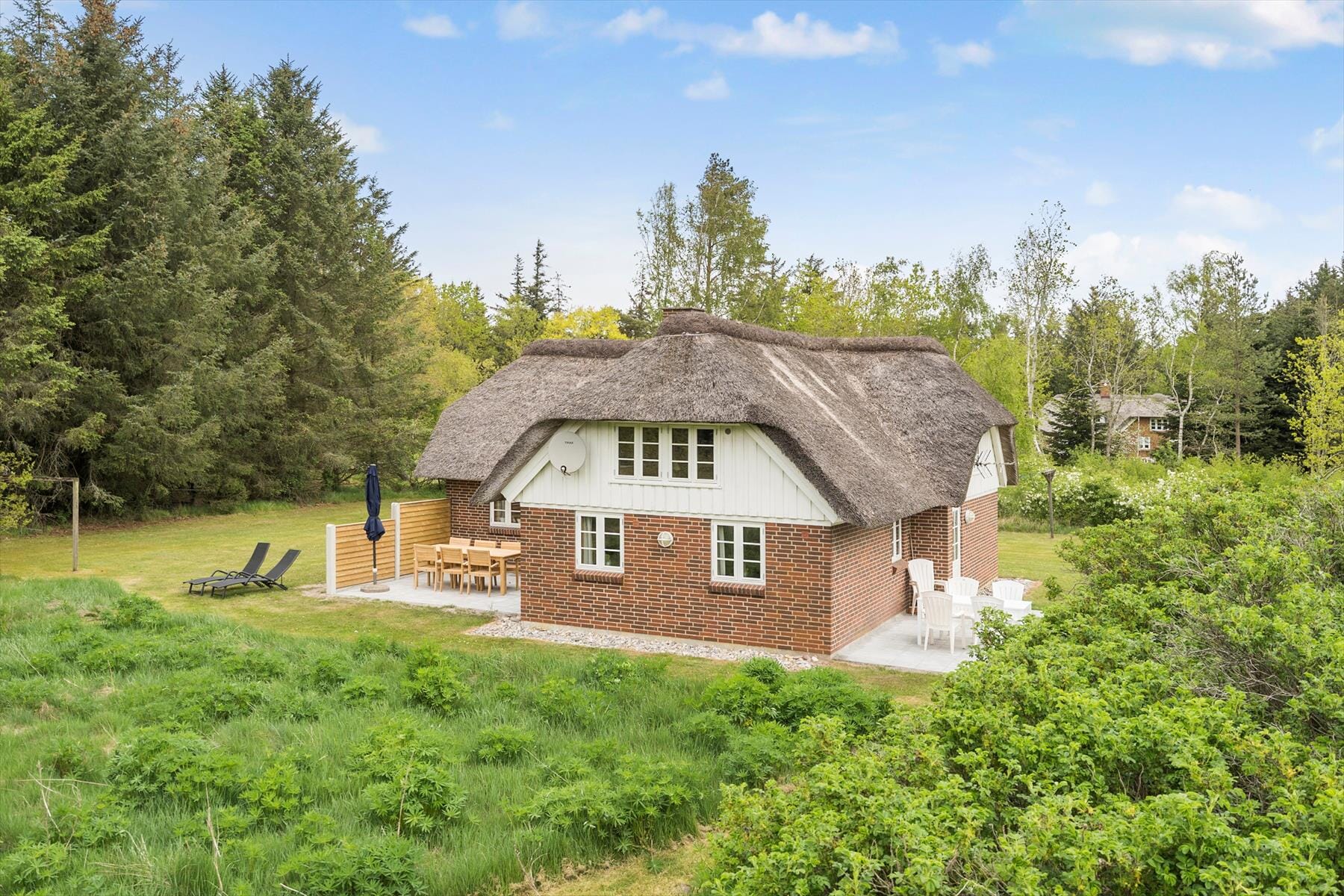 Zum Ferienhaus gehören zwei Terrassen, von denen eine nach Süden und die andere nach Osten weist. Die eine Terrasse wird von einem Windschutzzaun abgeschirmt und ist mit Gartenmöbeln ausgestattet. Das Haus liegt auf einem großen, von Bäumen und Büschen umgebenen Naturgrundstück.
