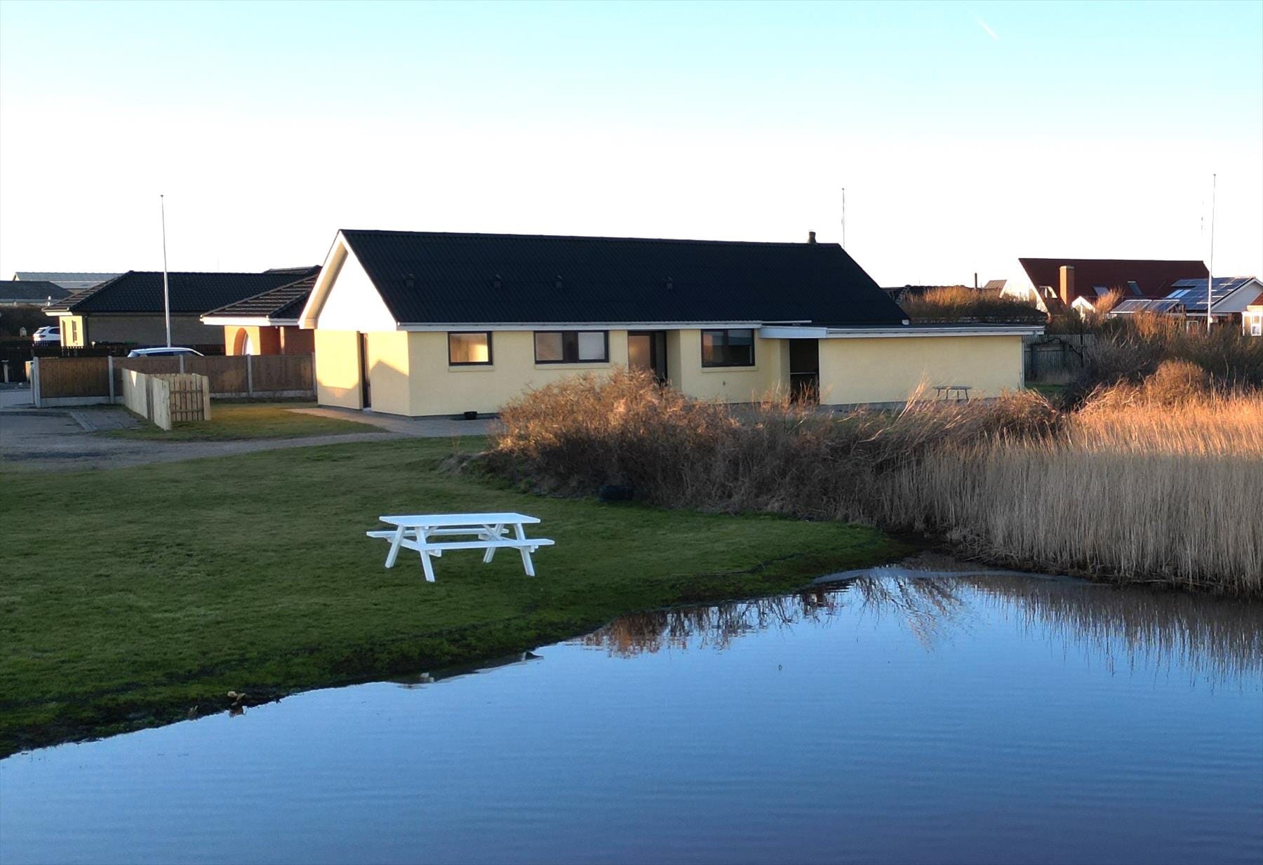 Vom Herzen des Hauses gelangen Sie direkt auf die sonnige Terrasse und genießen den Tag unter freiem Himmel. Die Rasenfläche umgibt das gesamte Haus und bietet Ihnen genügend Möglichkeiten, ein gemütliches Plätzchen zu finden, auch wenn das Wetter einmal wechselhaft ist. Schnappen Sie sich Ihre Kaffeetasse und laufen Sie hinunter zum Fjord, der nur 40 Meter vom Haus entfernt ist. Hier können Sie die wunderschöne Aussicht bewundern und einen unvergesslichen Sonnenaufgang über dem Wasser erleben.