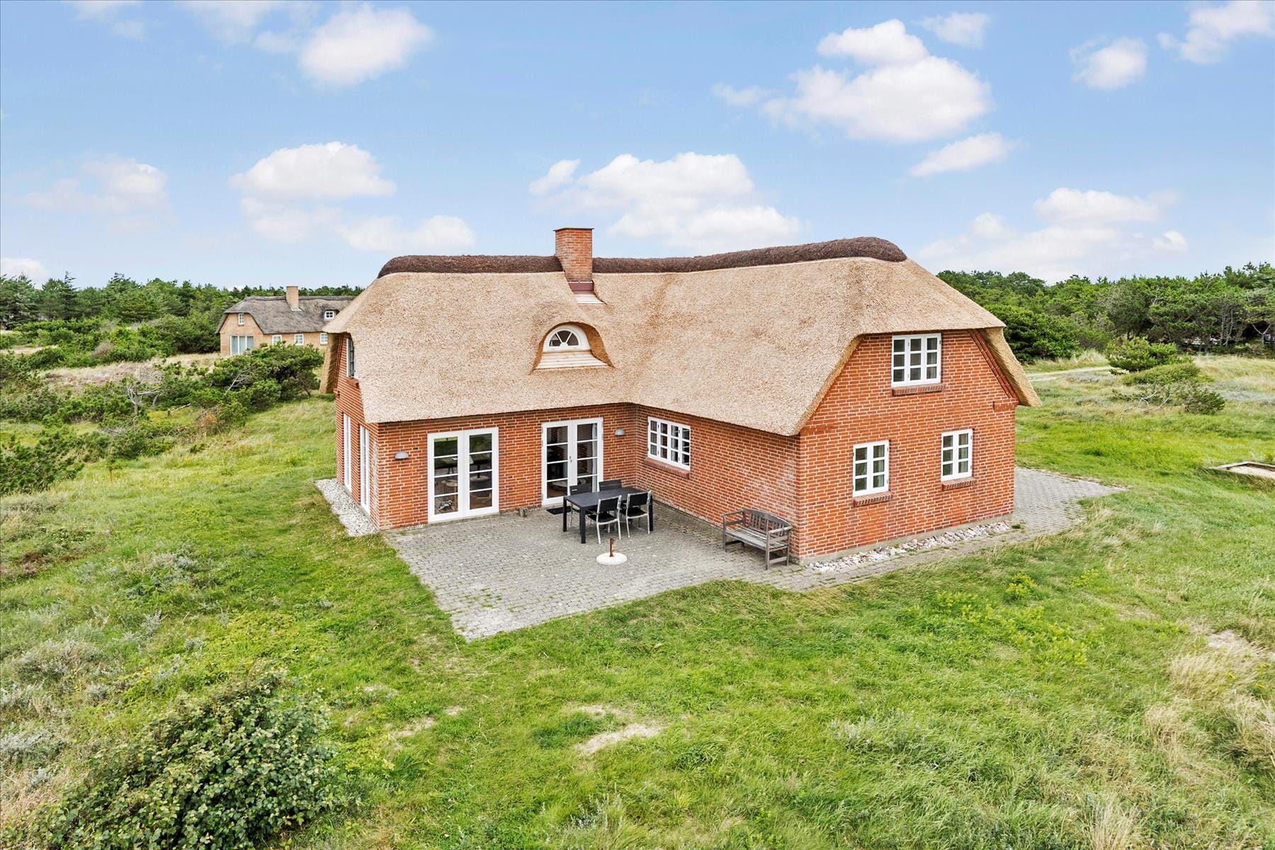 Dieses Reetdachhaus bietet seinen Gästen eine komfortable und gemütliche Einrichtung. Im Wohnraum sorgt ein Kaminofen für Wärme und typische dänische Ferienhausstimmung. Durch die großen Fenster des Wohnraums eröffnet sich Ihnen ein prachtvoller Ausblick auf die Dünen. Die teilweise offene Küche verfügt unter anderem über einen Geschirrspüler, einen Backofen, einen Kühlschrank und eine Gefriermöglichkeit. Von der Küche gelangen Sie hinaus auf eine nach Südosten gerichtete Terrasse. Das schöne Badezimmer im Erdgeschoss verwöhnt mit einer Sauna, einer Dusche und einem Whirlpool. Im Obergeschoss ist praktischerweise ein Gäste-WC inklusive Dusche platziert. Zwei der insgesamt vier Schlafräume befinden sich im Erdgeschoss. Einer dieser Schlafräume ist mit einem Doppelbett versehen, der andere mit einem Etagenbett. Im Obergeschoss erwarten Sie ein Schlafraum mit einem Doppelbett und ein Schlafraum mit zwei Einzelbetten. Alle Schlafräume und der Aufenthaltsraum im Obergeschoss sind mit Teppichboden ausgelegt. Der Rest der Wohnfläche ist gefliest.